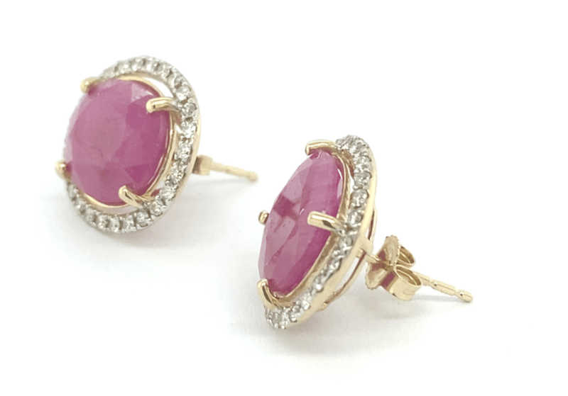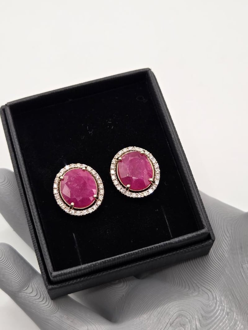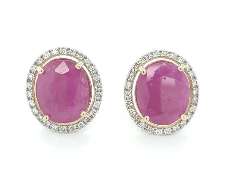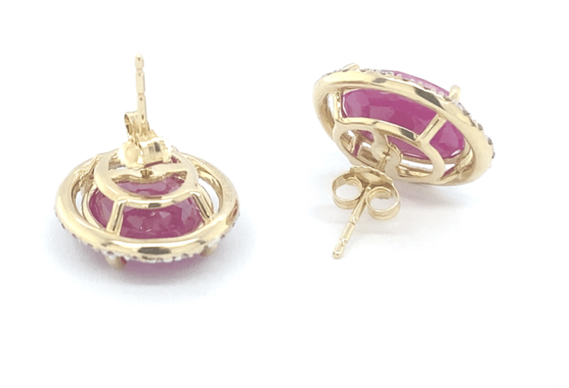 Certified Pair Of 14Ct Yellow Gold Earrings Each Set With A Natural Purplish-Red Oval Ruby Surrounded By Micro-Set Round Brilliant Cut Diamonds. The Two Rubies Total 9.74Ct, Accented By 0.54Ct Of Diamonds (J–K Colour, Si2–I2 Clarity). Fitted With Post Backs And Butterfly Clasps. Valued By Gemley Valuations (Sydney) At A$12,590.