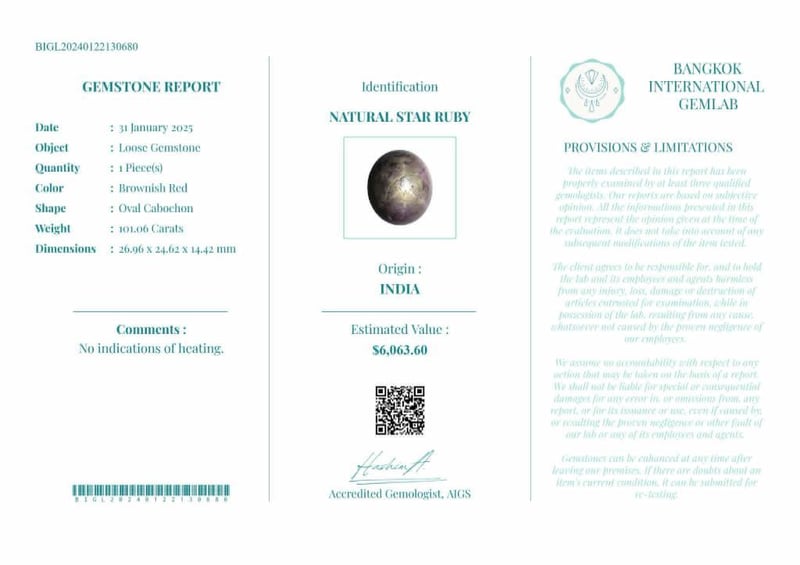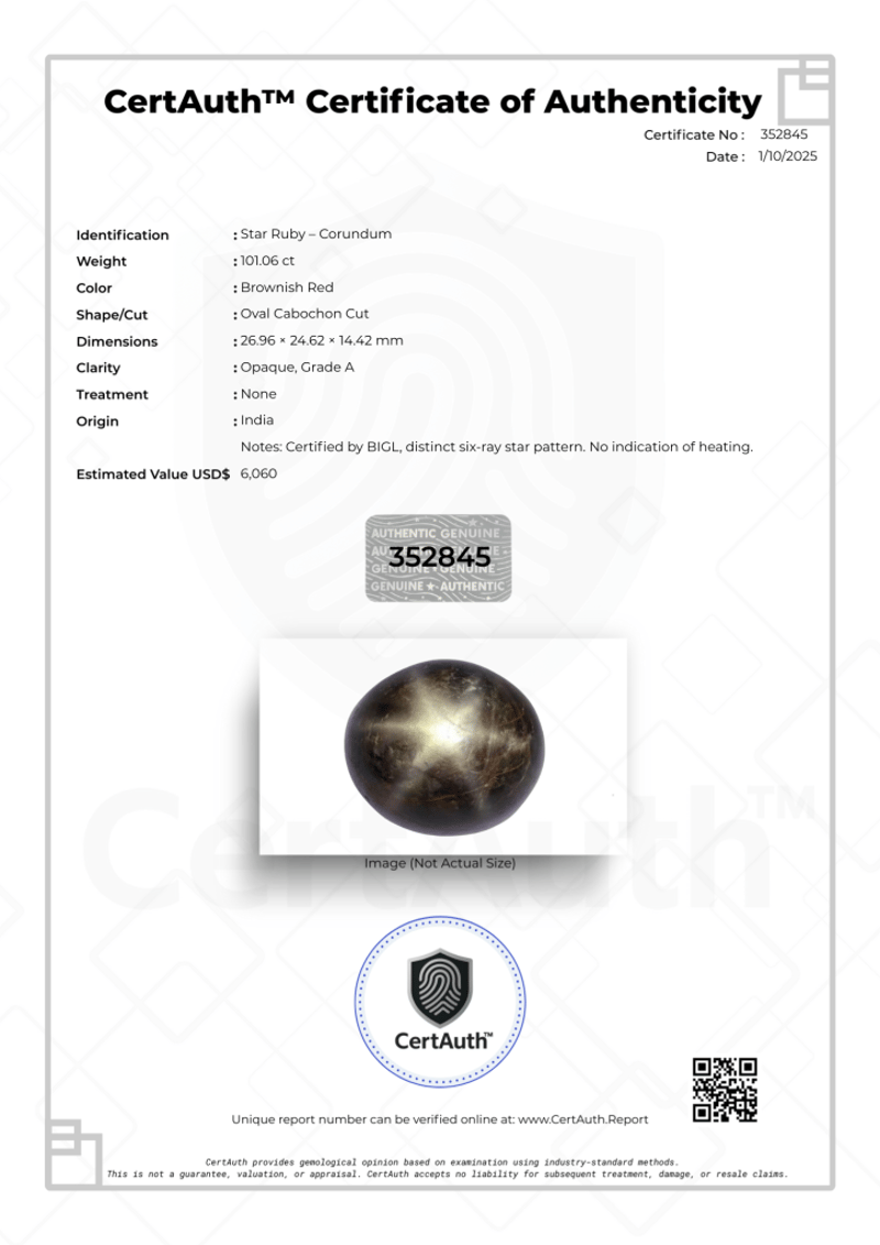 An Extraordinary 101.06-Carat Natural Star Ruby Exhibiting A Distinct Six-Ray Asterism Across A Brownish-Red Body Tone. Expertly Cut Into An Oval Cabochon, This Gemstone Displays A Strong, Symmetrical Star Effect Under Direct Light — A Hallmark Of Fine Corundum From India. Certified By Both Bangkok International Gem Lab (Bigl) And Certauth™, Confirming Its Authenticity And Absence Of Heating Treatment.