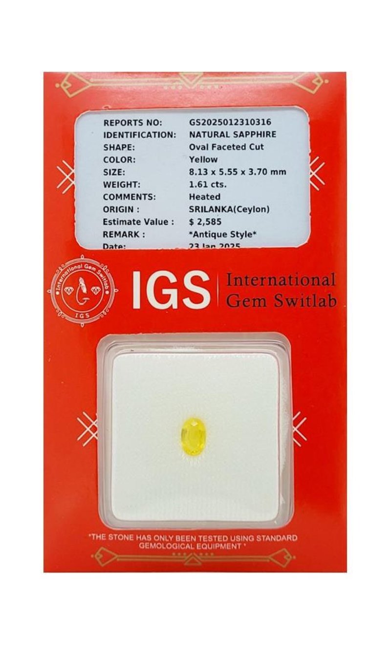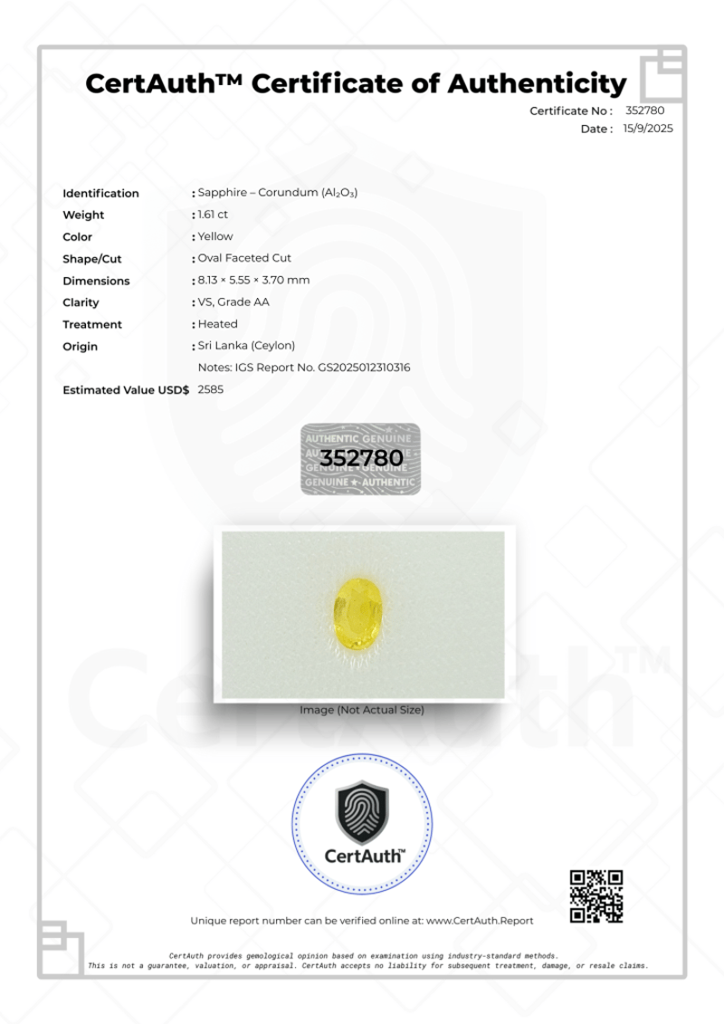 A Bright And Lively Natural Yellow Sapphire Weighing 1.61 Carats, Expertly Cut In An Oval Faceted Shape. This Gemstone Displays A Vivid Golden Hue With Excellent Brilliance And Clarity, Typical Of Fine Ceylon Sapphires. Professionally Heated To Enhance Colour And Clarity. Certified By Igs And Authenticated By Certauth™.