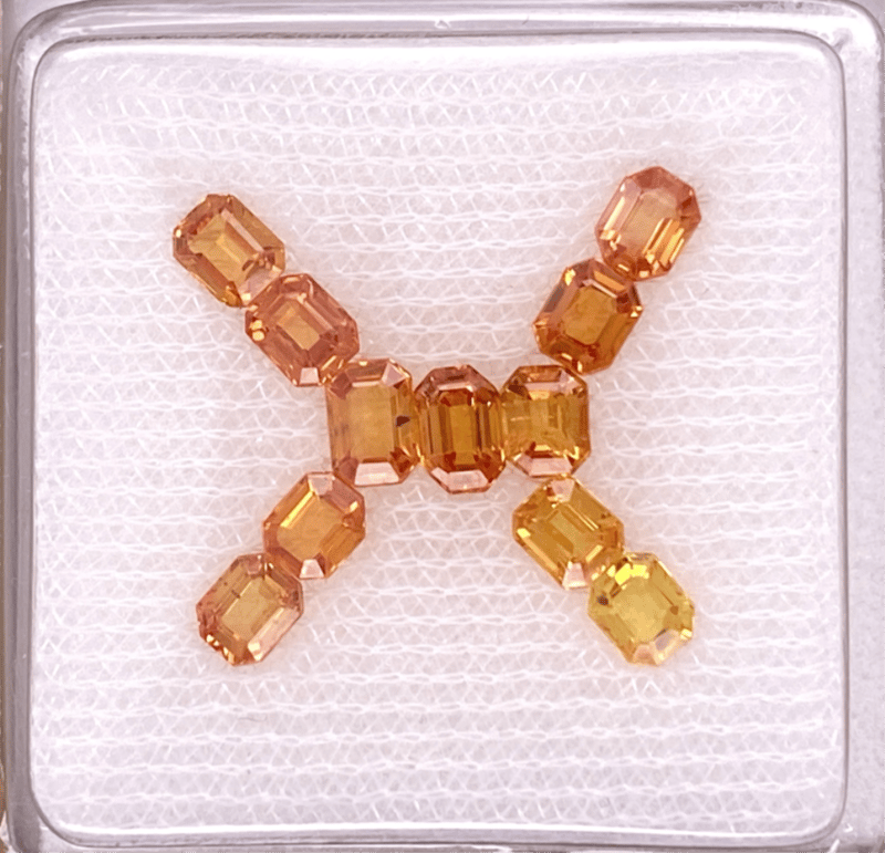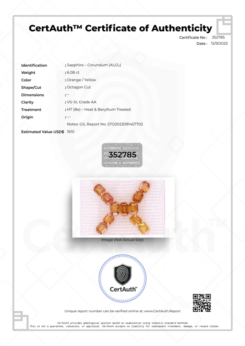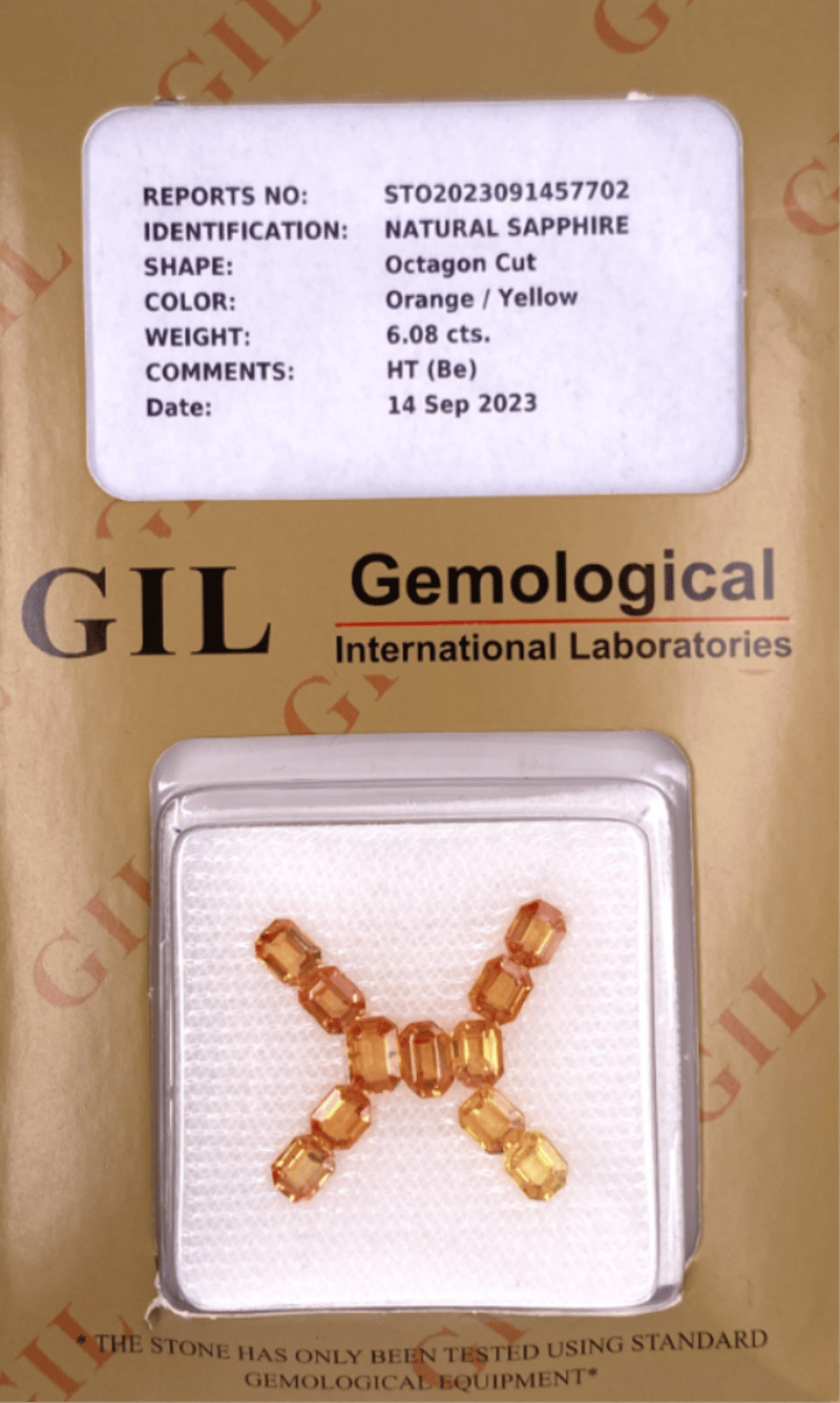 A Certified Parcel Of Natural Sapphires Totalling 6.08 Carats, Displaying A Vivid Mix Of Orange And Yellow Hues. Each Sapphire Is Expertly Octagon-Cut With Excellent Polish And Brilliance, Grading Between Vs–Si Clarity. Professionally Heat And Beryllium Treated To Enhance Colour And Transparency. Certified By Gil And Authenticated By Certauth™.