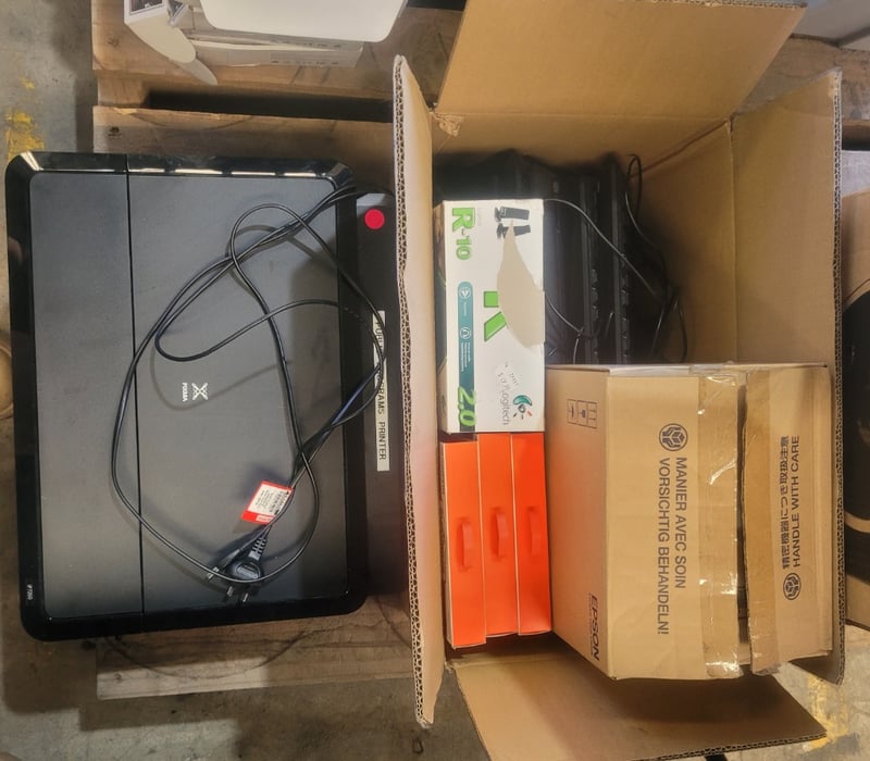 Assorted Pallet Of Computer Accessories Including:Epson TM T20 Printer, Logitech desktop speakers, Canon Pixma IP2260 Desktop Printer and more.Inspection RecommendedNote: Working Condition UnknownSold As Lot