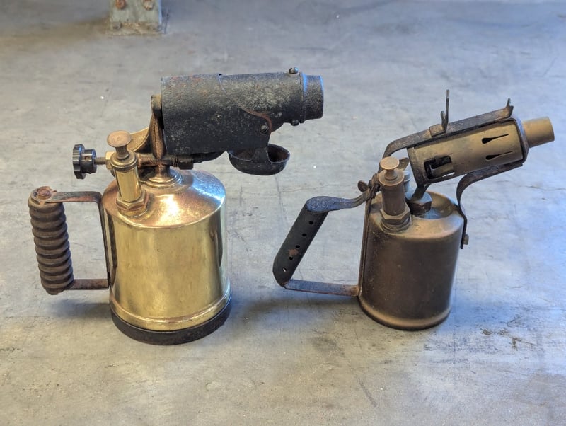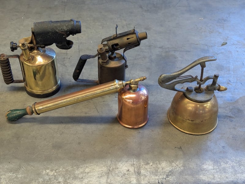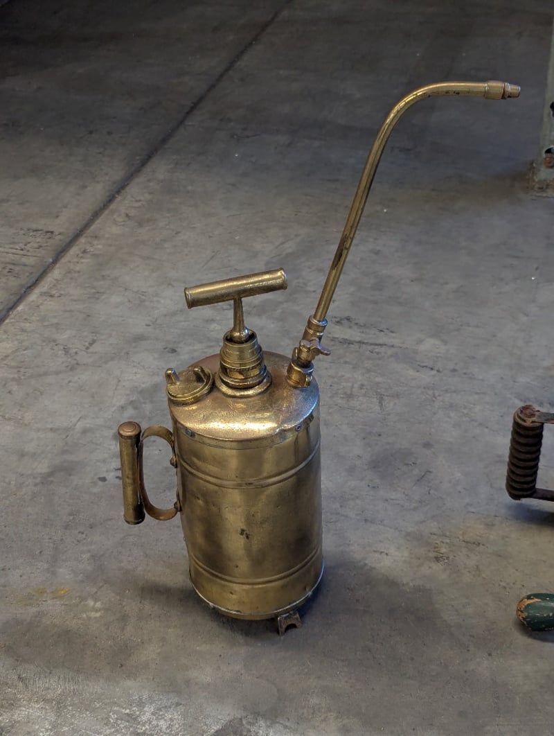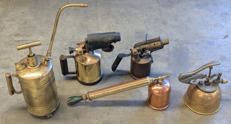 THREE BRASS STYLE SPRAYERS AND TWO BRASS BLOWTORCH
