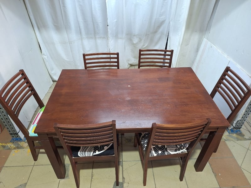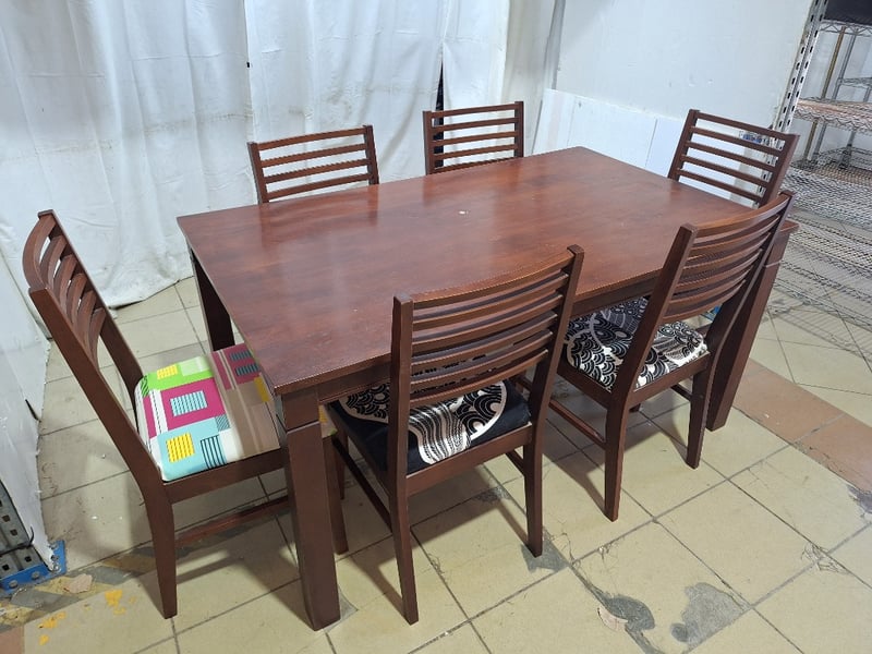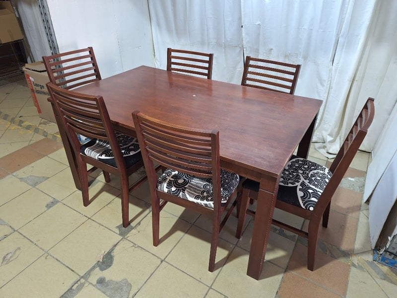 6 Seater Dining Table, Chairs Has Unique Seat Cushions, Timber Style, Brown Finish