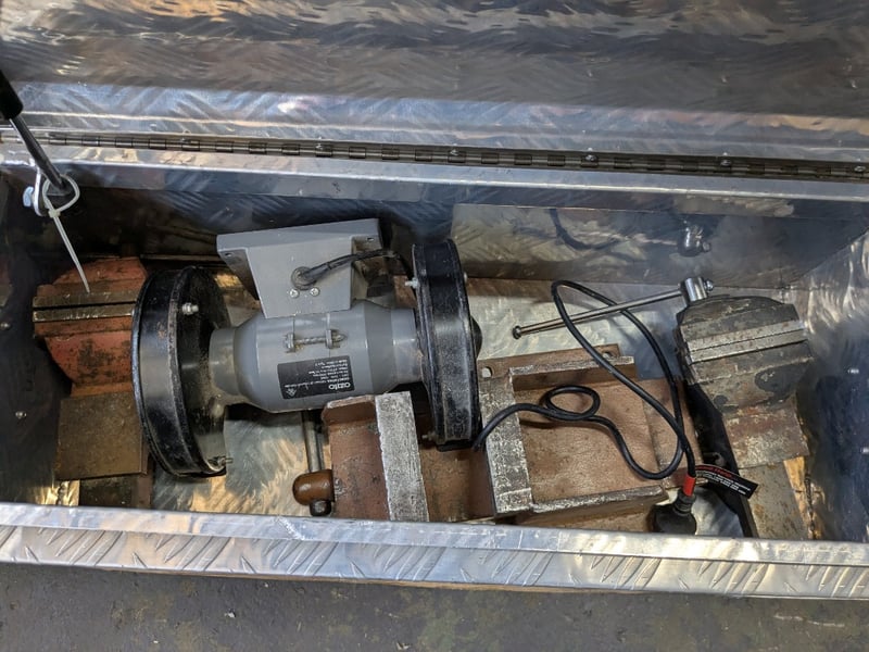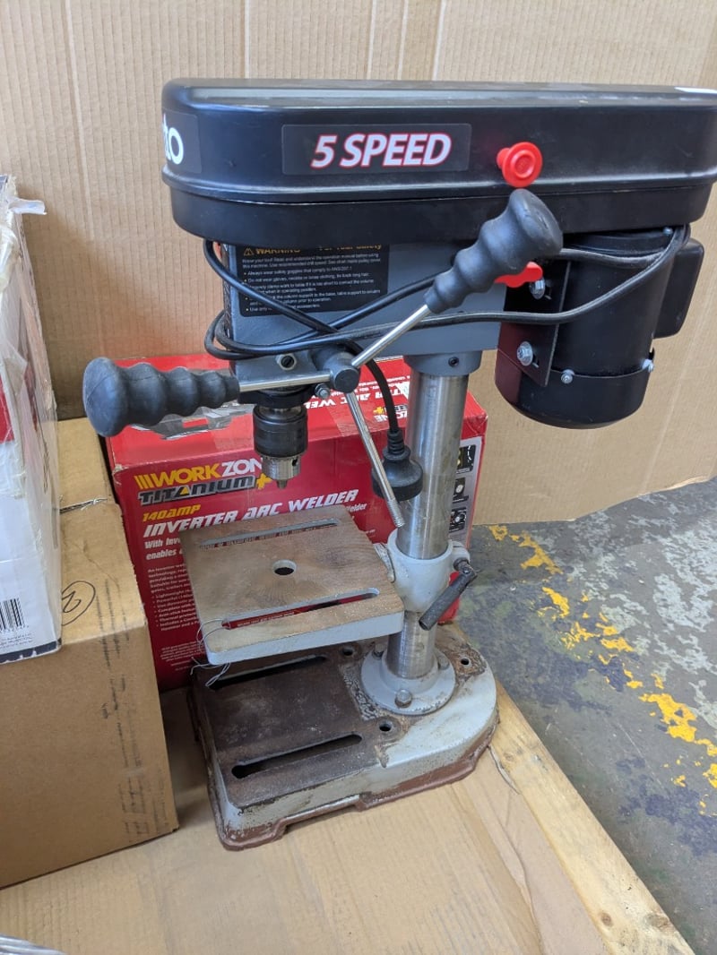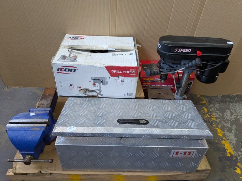 Tools, including adjusting vice, Ozito drill press, Workzone Arc welder and more Sold as lot