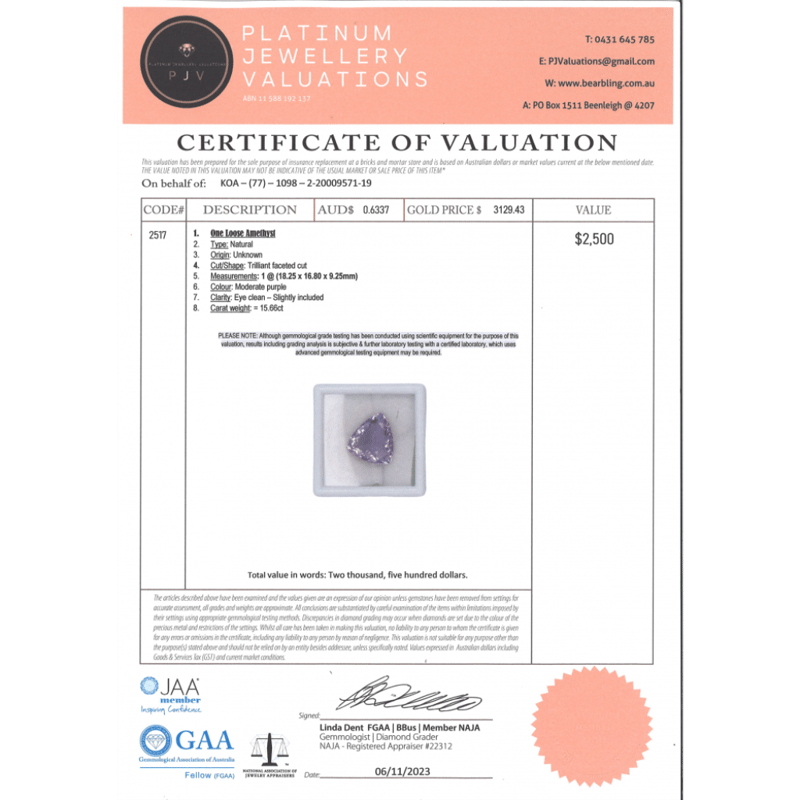 15.66CT NATURAL AMETHYST, TRILLIANT FACETED CUT, MODERATE PURPLE, EYE CLEAN - SLIGHTLY INCLUDED, LOOSE, UNSET. Valuations Provided by an Independent Third-Party Professional Not Directly Associated With Lloyds Auctions at AUD $$2,500.00This valuation has been conducted by an independent third-party professional. The valuation amount is an assessment by the issuing valuer and does not reflect the auction value of the item. Any inquiries regarding the valuation should be directed to the issuing valuer (refer to contact details on the certificate), as Lloyds Auctions has no affiliation or influence over the valuation, the valuer, or the stated amount. Condition: Good - Refer Images 0+2358