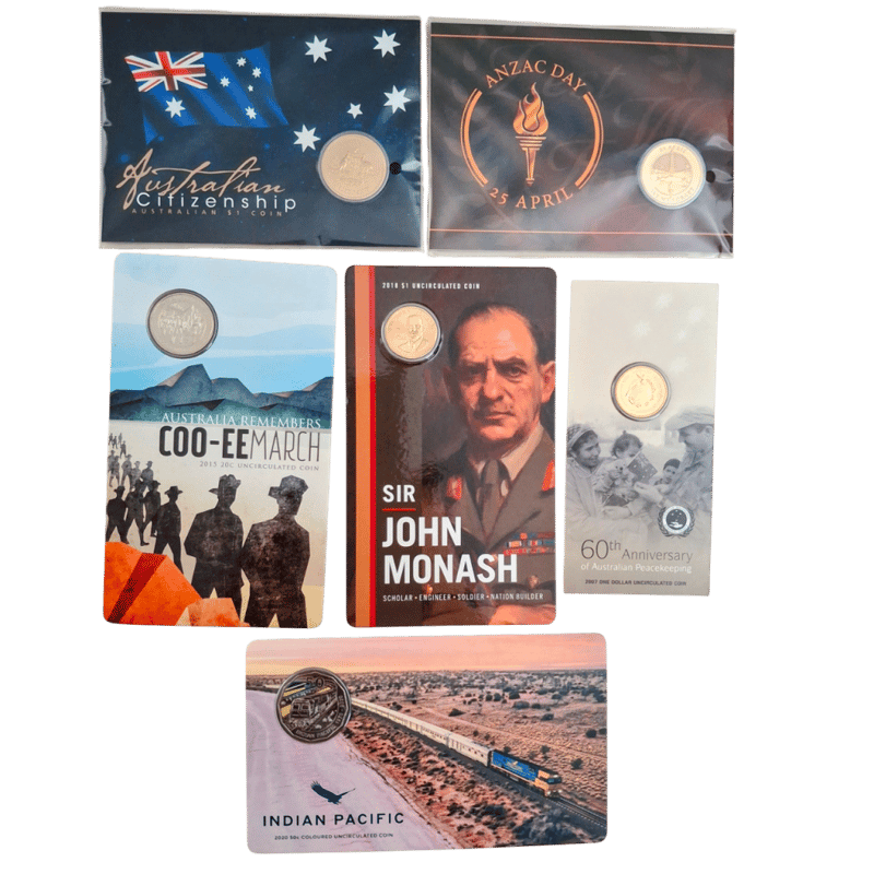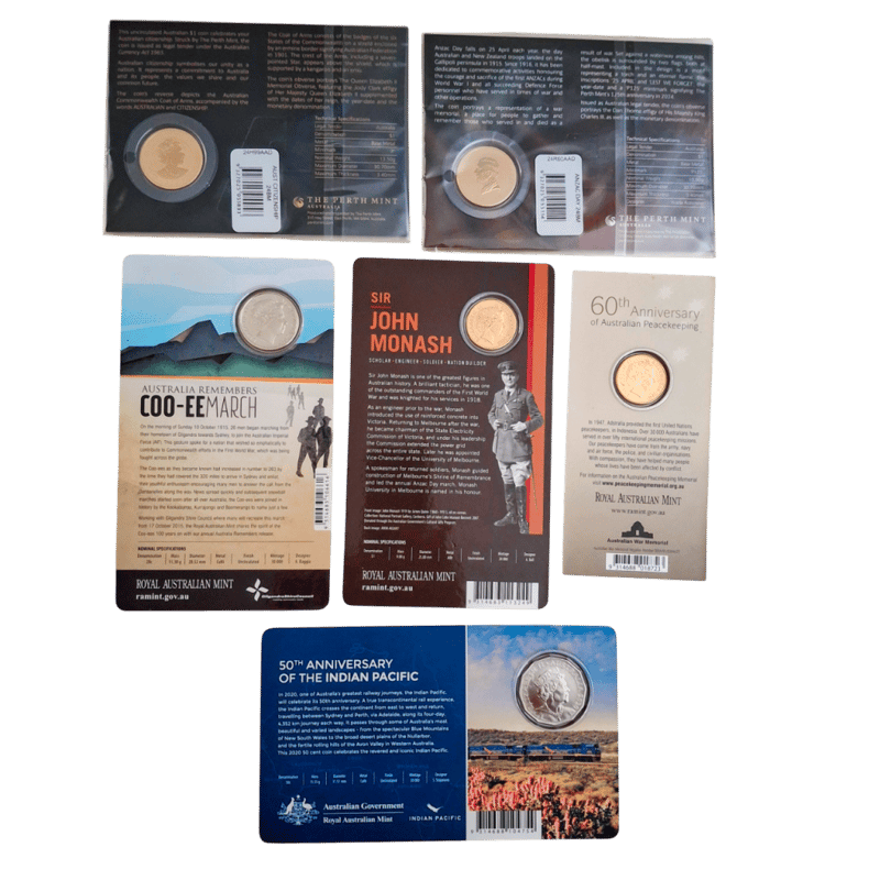 Anzac Day Perth Mint, Australian Citizenship 2022 Perth Mint, 2007 Ram 60Th Anniversary Peacekeeping, 2018 Sir John Monash $1, 2015 Coo-Ee March 20C & 2020 Indian Pacific 50C