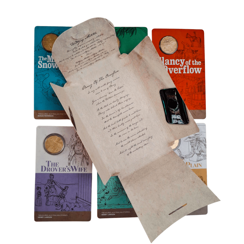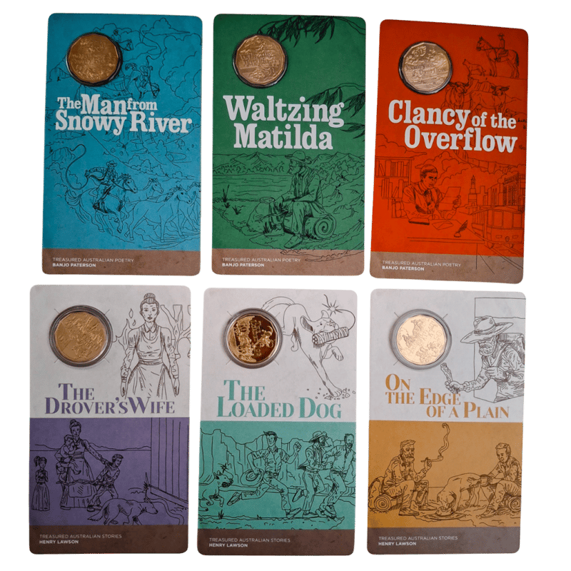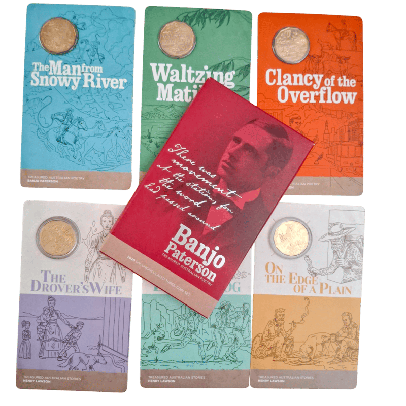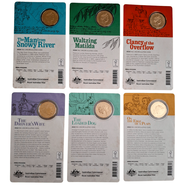 50C Banjo Patterson Collection Including Box For Man From Snowy River, Waltzing Matilda And Clancy Of The Overflow, Total 6X 50C Carded Themed Coins