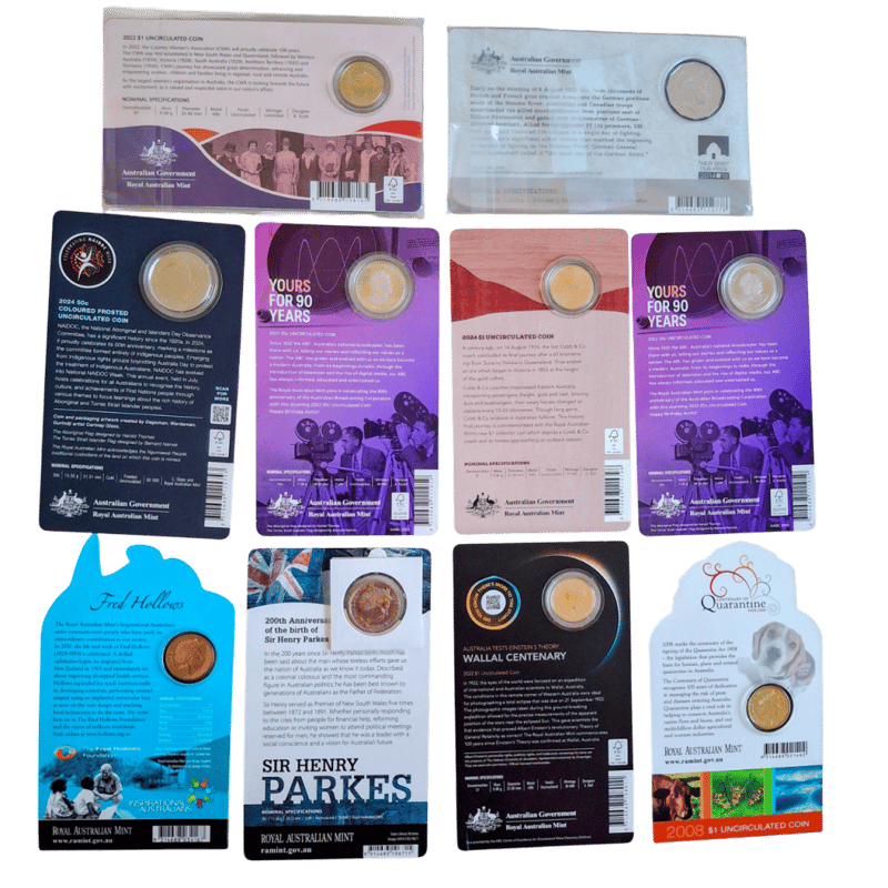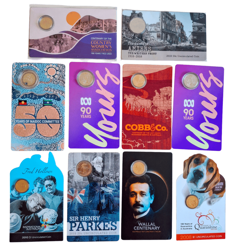 Country Womens Association 2022 $1, Battle Of Amiens 2018 50C, 2X Abc 90 Years 2022 20C (30,000 Mintage), Cobb And Co $1 (37,500 Mintage) - Note Slight Crease On Front Cover, Naidoc 50C Coloured, Wallal Centenary 2022 $1 (30,000 Mintage), Sir Henry Parkes 2015 20C (Note: Replaced Plastic Coin Holder - See Photo), Fred Hollows 2010 $1 & 100 Years Of Quarantine 2008 $1