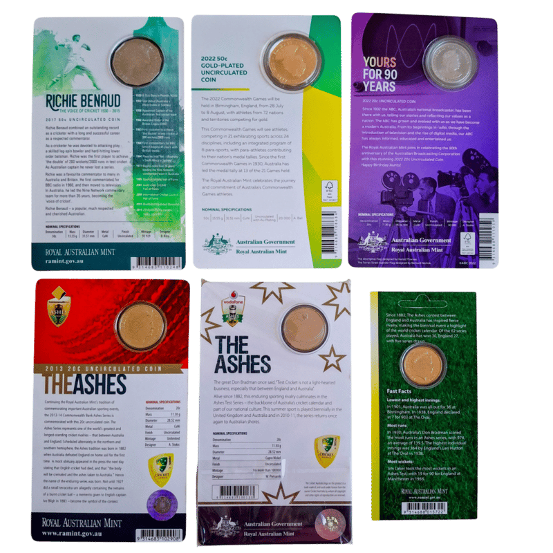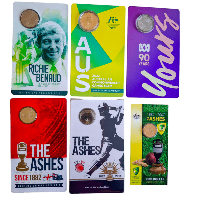 Richie Benaud 2017 50C, 2022 50C Commonwealth Games, 90 Years Abc 20C (30,000 Mintage), 2007 Ashes $1, 2011 20C Ashes & 2013 20C Ashes