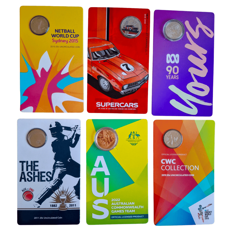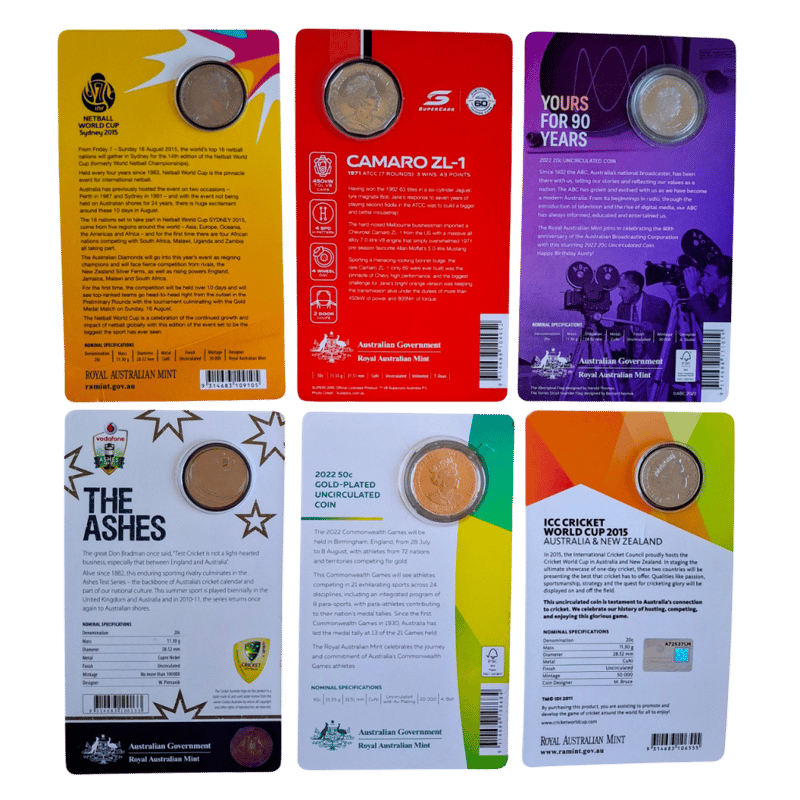 2015 Netball World Cup 20C (Note: Crease On Lower Front Of Card), Chev Camaro Coloured 50C, Abc 90 Years 20C, Ashes 2011 20C Cricketball Coin, Aus Commonwealth Games 2022 50C Au Plating, 2015 20C Icc World Cup