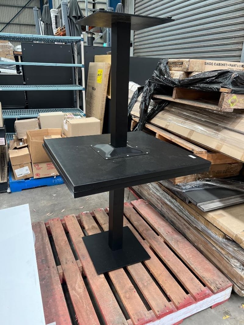 Tables, brand/ model unknown, metal type leg, colour black Dimensions approx; 80x80x74cm Quantity; 2 sold as lot