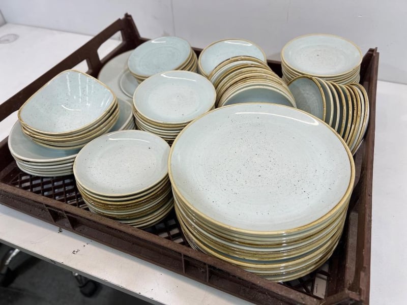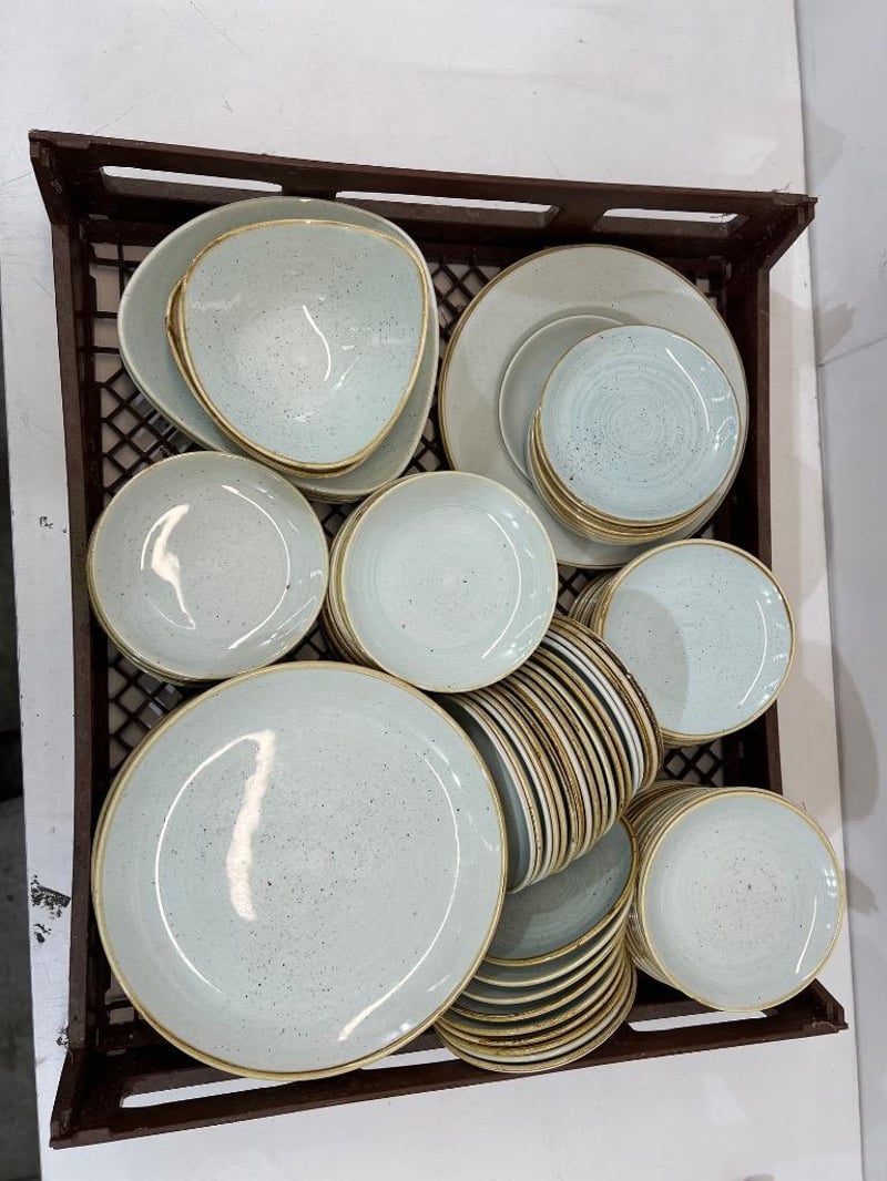 Dishware, Churchill, includes; plates, bowls etc, blue/ gold colour sold as lot