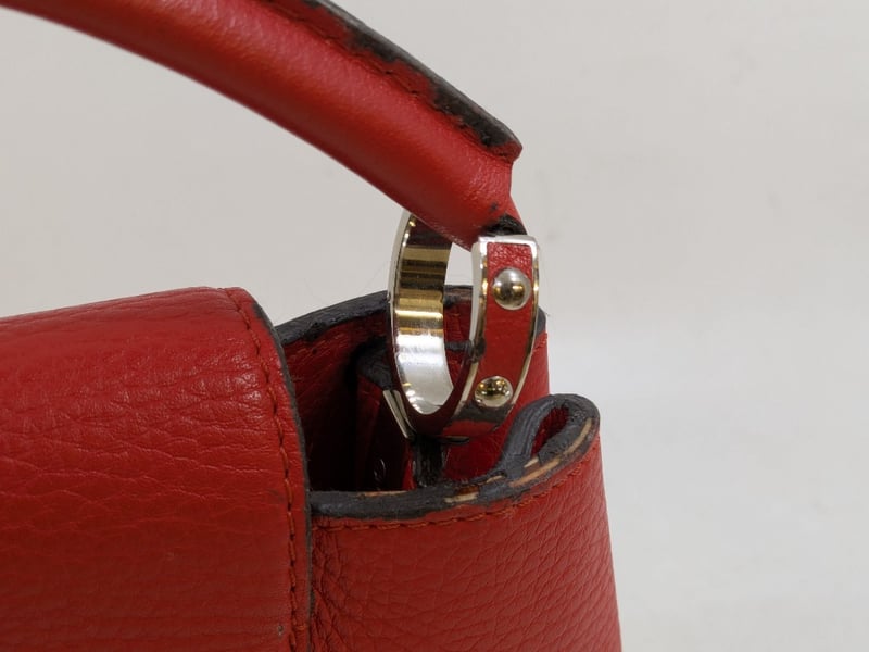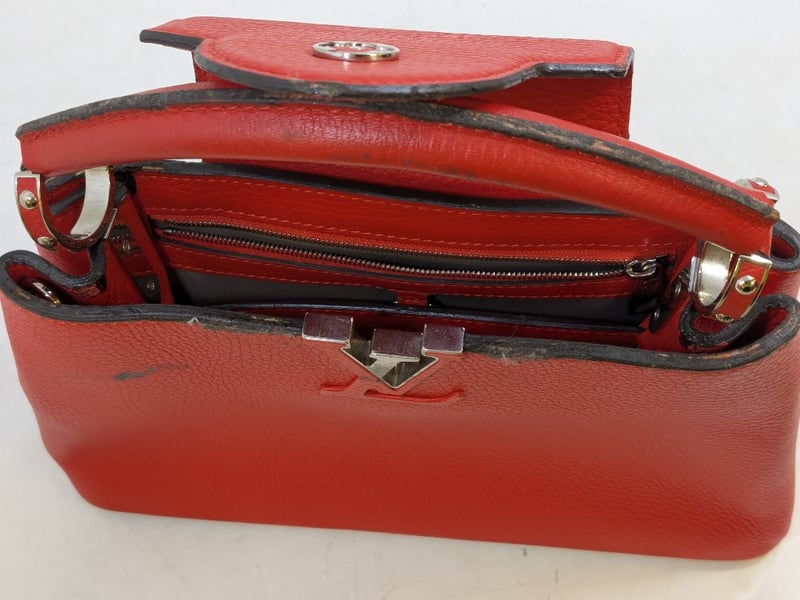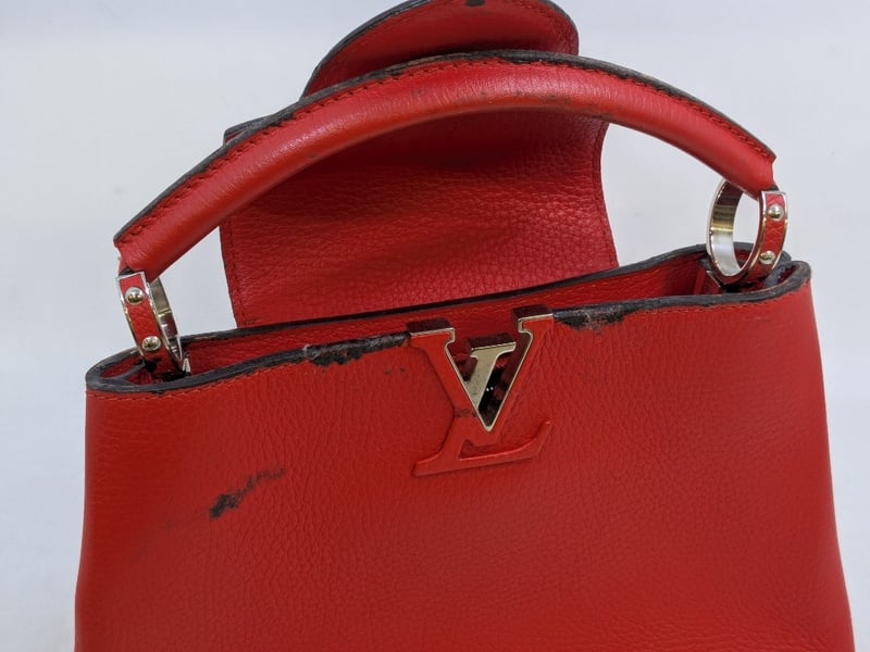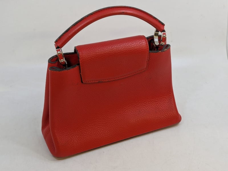 LOUIS VUITTON RED HANDBAGItem Size: Height: 27cm, Width: 27cm, Depth: 9cmTaurillon Leather, Single Rolled Top HandleCompartments Include One Interior Zipper Pocket, Two Interior Compartments With DividerNotes: Minor Wear PresentCondition: Fair - Refer To Images585009+9
