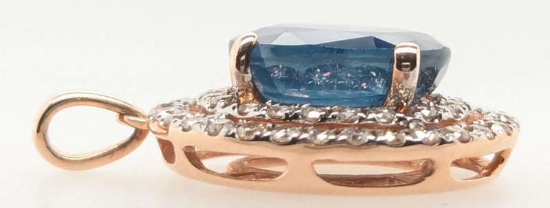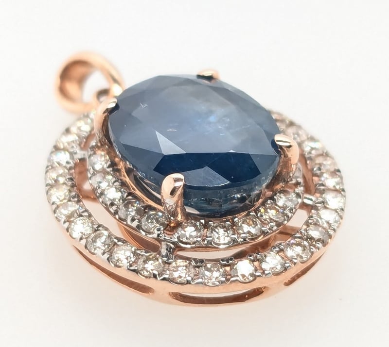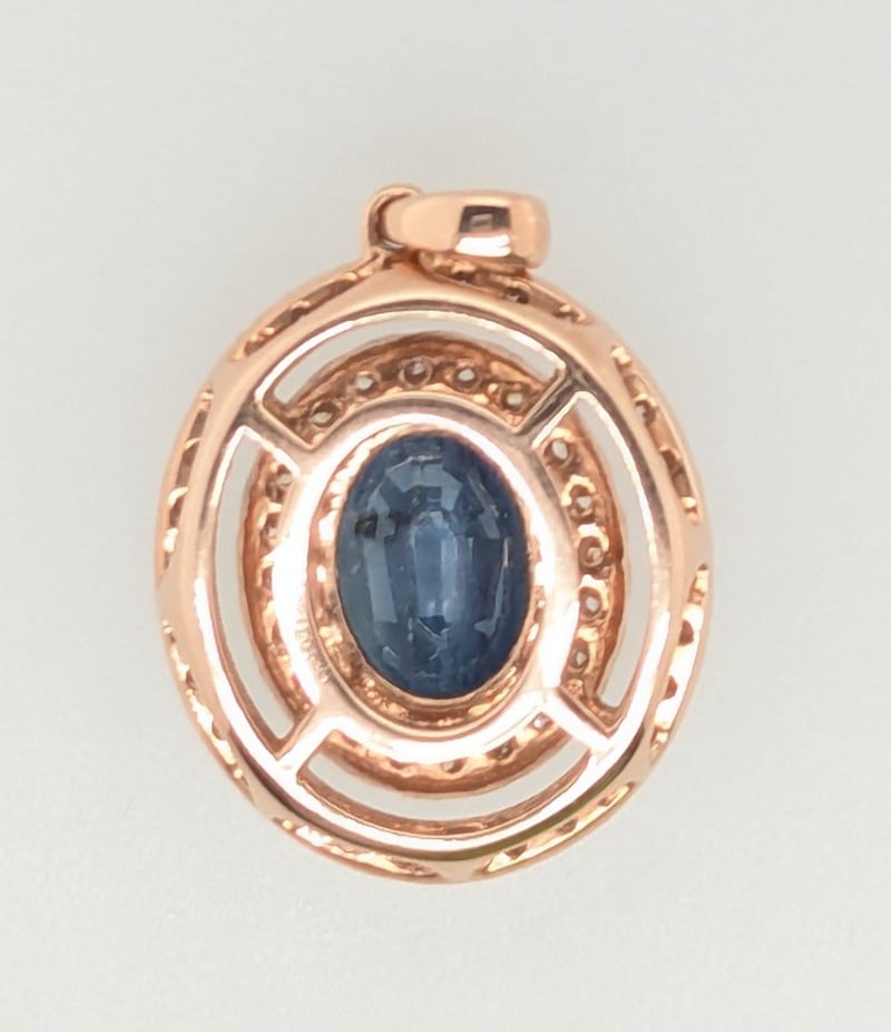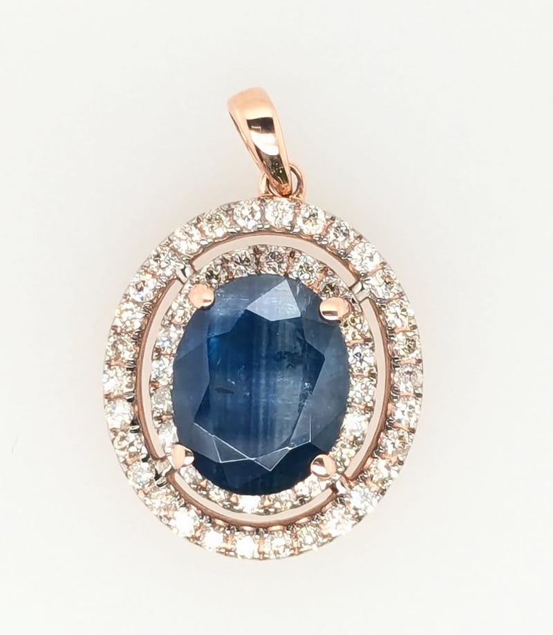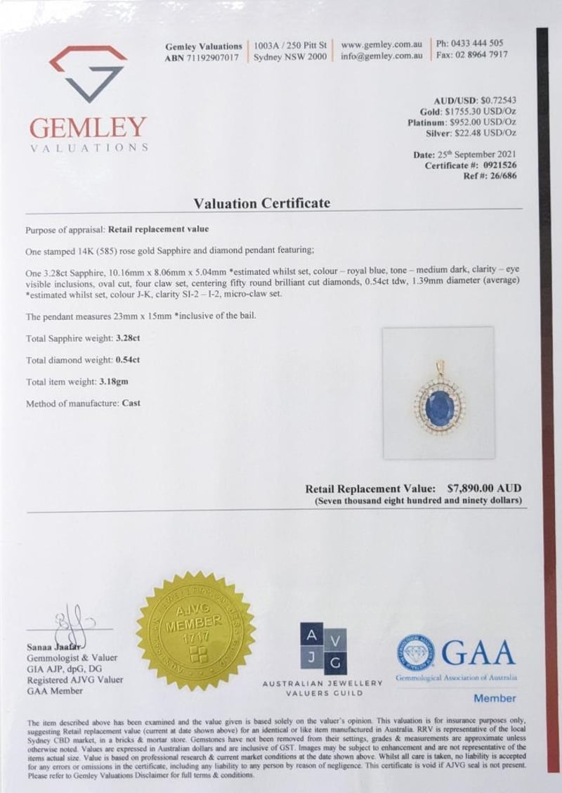 14CT ROSE GOLD, BLUE SAPPHIRE AND DIAMOND, DOUBLE HALO PENDANT Accompanied By Gemley Valuation Certificate. The Centre Features, One Oval Cut, Royal Blue, Sapphire (3.28Ct, Eye Visible Inclusions), 4 Claw Set. Surrounding The Centre In A Double Halo Are, 50 Round Brilliant Cut, Diamonds (0.54Ct Tdw, J-K Colour, Si2-I2 Clarity), Micro-Claw Set. Condition: Good - Refer To Images This valuation has been conducted by an independent third-party professional. The valuation amount is an assessment by the issuing valuer and does not reflect the auction value of the item. Any inquiries regarding the valuation should be directed to the issuing valuer (refer to contact details on the certificate), as Lloyds Auctions has no affiliation or influence over the valuation, the valuer, or the stated amount. Insurance Replacement Valuation Amount: $7,890.00 FC 162993+4