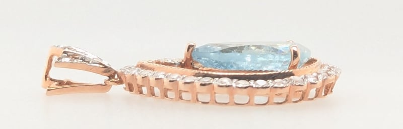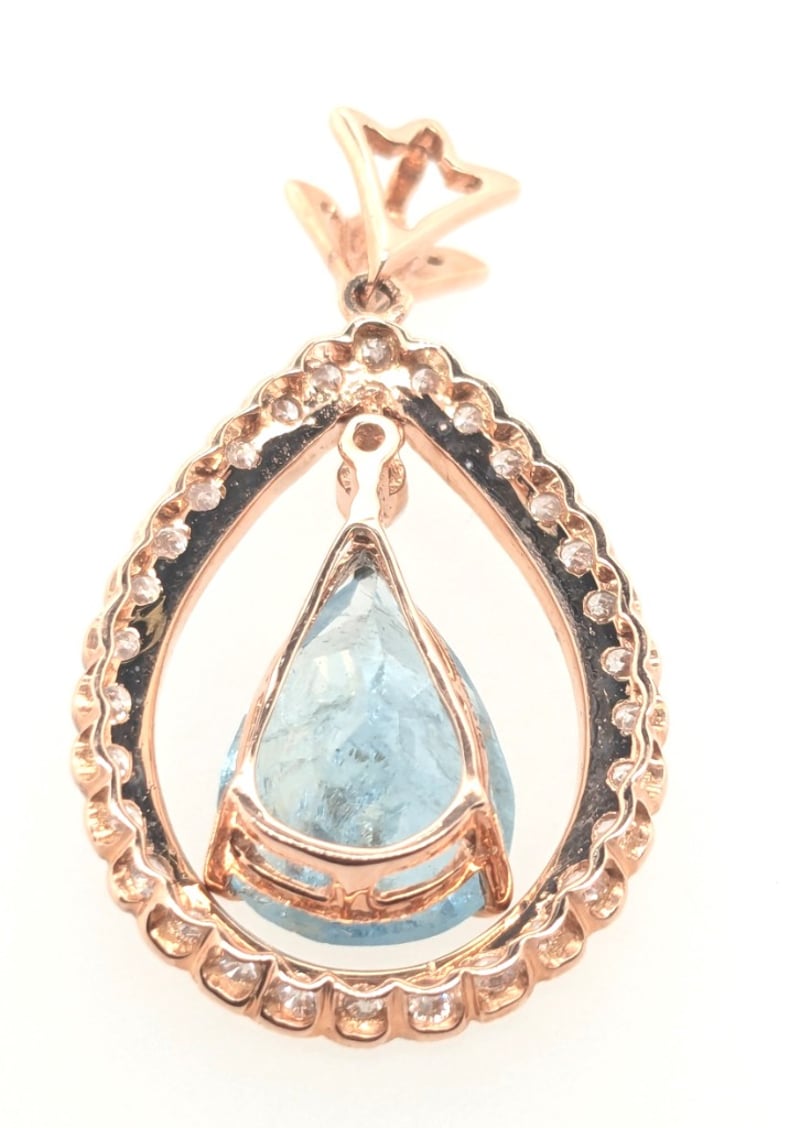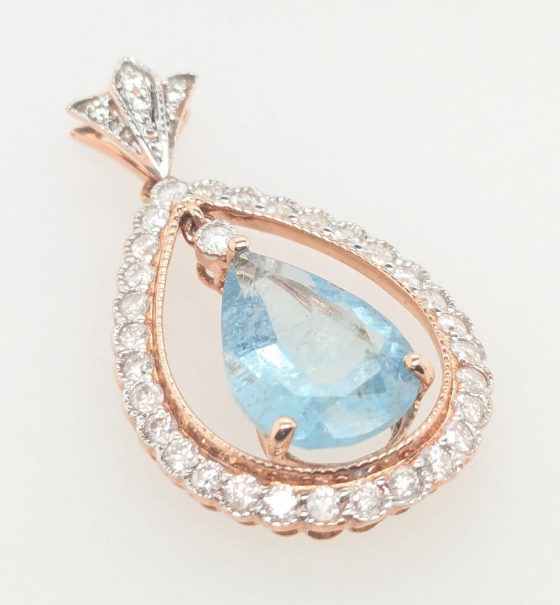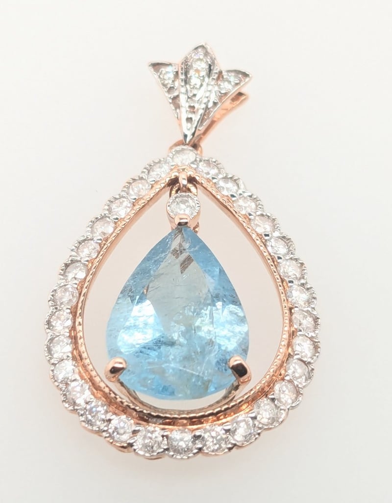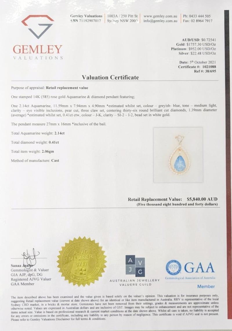14K ROSE GOLD, AQUAMARINE AND DIAMOND, DECORATIVE HALO PENDANT.Accompanied By Gemley Valuation Certificate.The Centre Features, One Pear Cut, Greyish-Blue, Aquamarine (2.14Ct, Eye Visible Inclusions), 3 Claw Set. Surrounding The Centre In A Halo And Decorating The Bail Are, 36 Round Brilliant Cut, Diamonds (0.41Ct Tdw, J-K Colour, Si2-I2 Clarity), Bead Set In White Gold.Dimensions: Height: 11.59mm, Width: 7.94mm, Depth: 4.90mmCondition: Good - Refer To ImagesThis valuation has been conducted by an independent third-party professional. The valuation amount is an assessment by the issuing valuer and does not reflect the auction value of the item.Any inquiries regarding the valuation should be directed to the issuing valuer (refer to contact details on the certificate), as Lloyds Auctions has no affiliation or influence over the valuation, the valuer, or the stated amount.Insurance Replacement Valuation Amount: $5,840.00FC162993+6