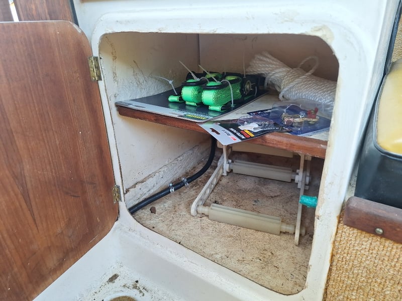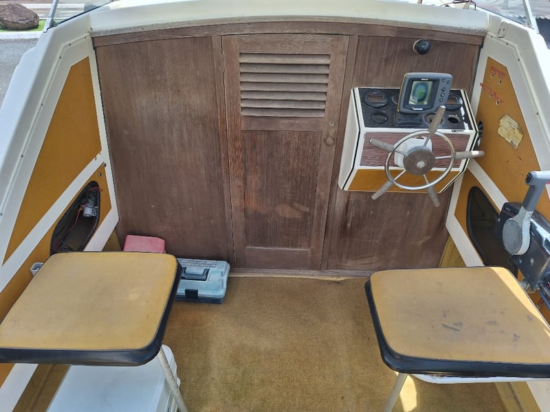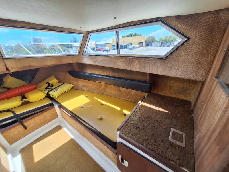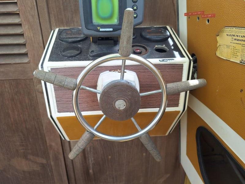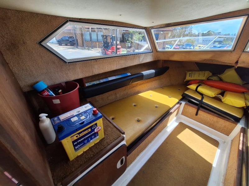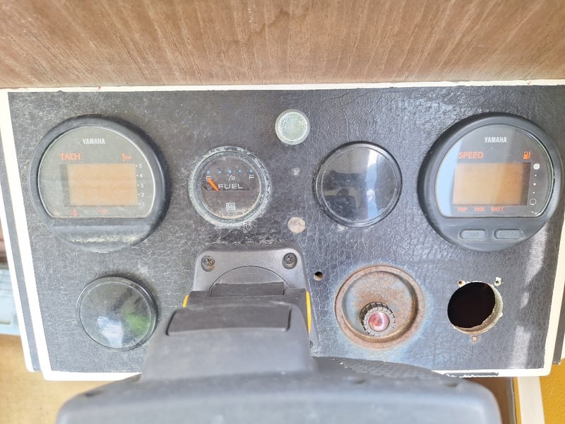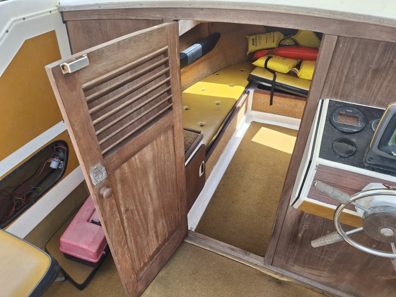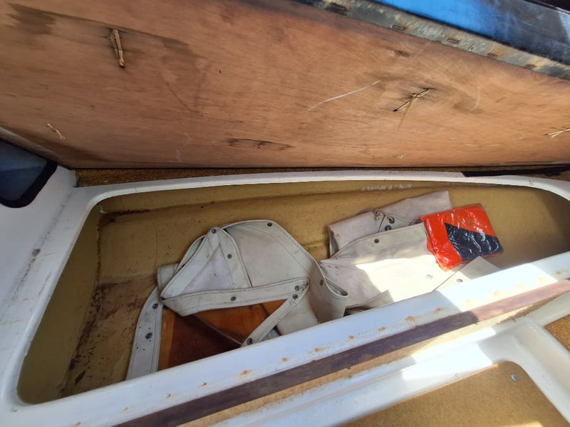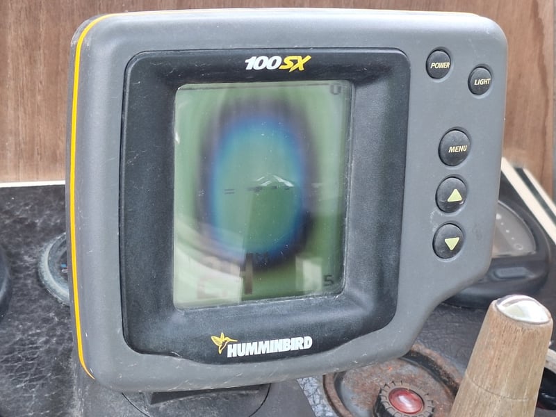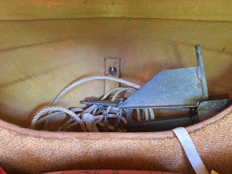 Description: Life Jackets, Anchor With Rope & Chain, Humminbird 100SX Sounder (Damaged Screen), Storage Compartments