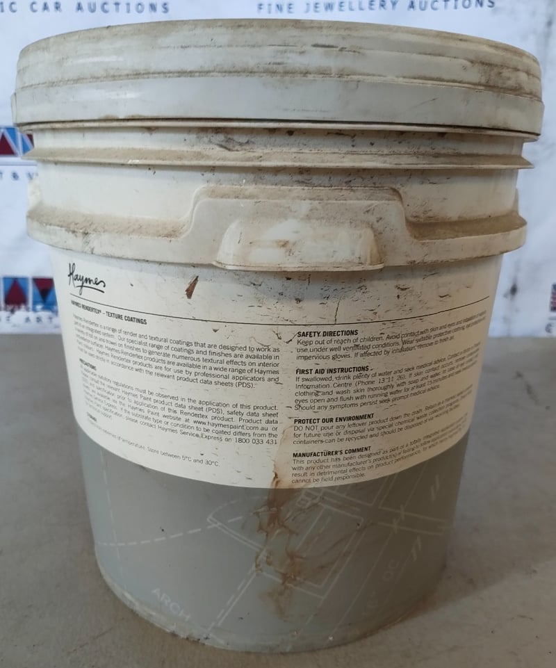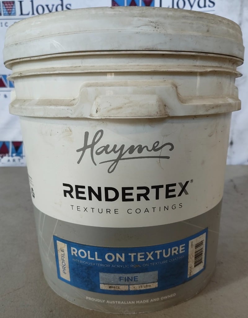 PAINT, HAYMES, RENDERTEX, ROLL ON TEXTURE, ACRYLIC ROLL ON, FINE, WHITE, 15LBID PER LITRE, MUST TAKE 15 LITRES