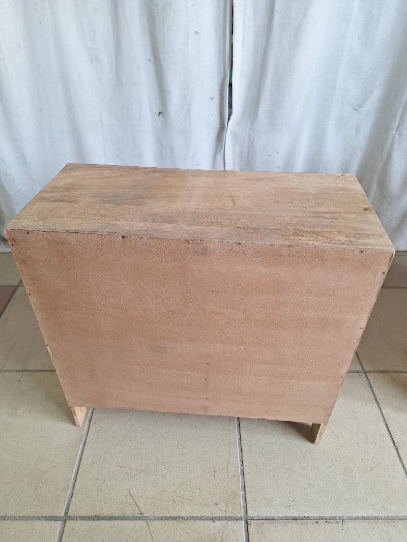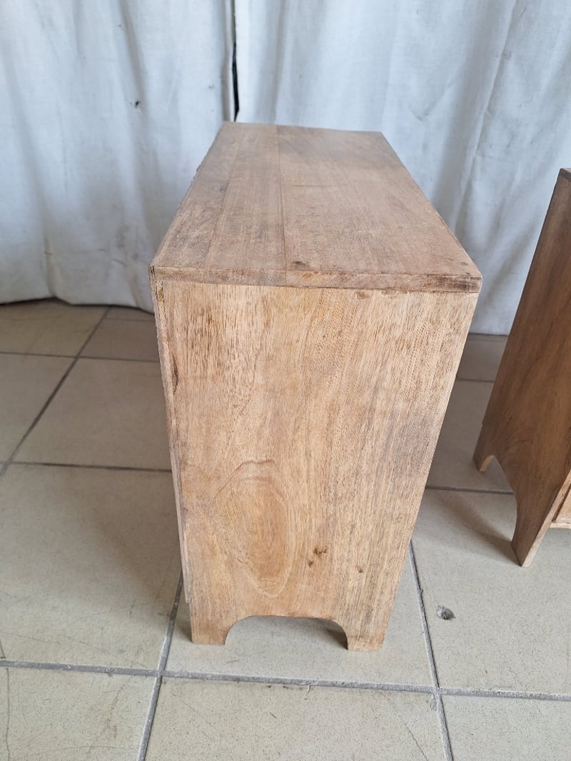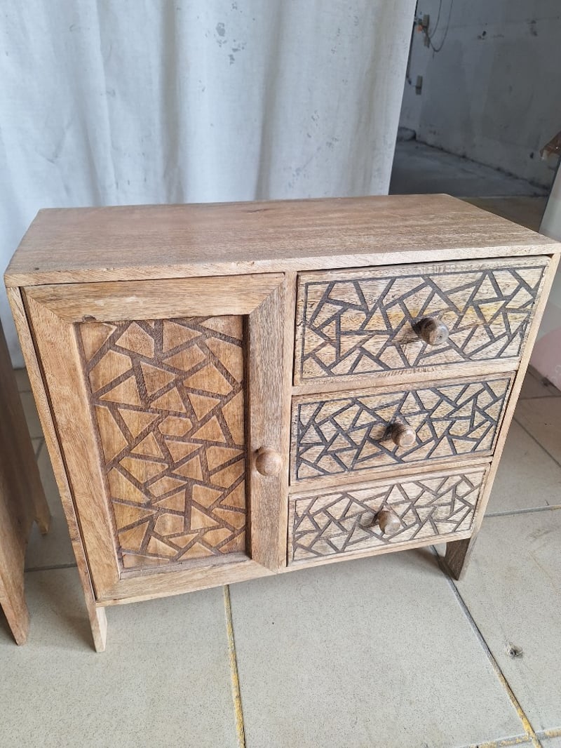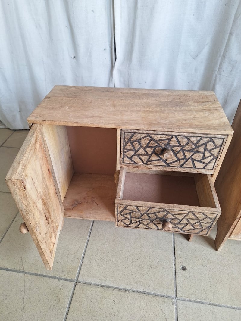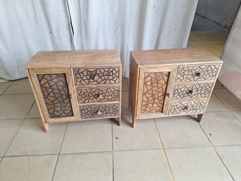 x2 Small Side Tables With Multiple Drawers, Pattern On Front, Timber Style, Brown Finish