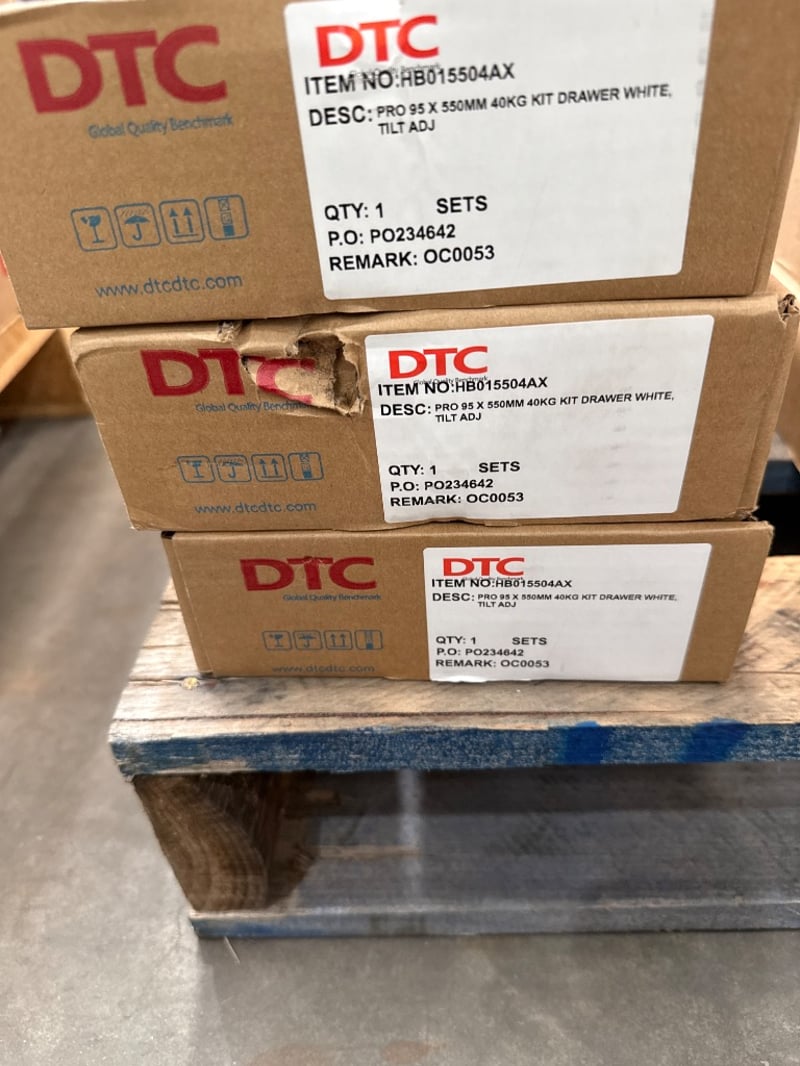 Drawer Kit, DTC PRO 95 X 550MM 40kg kit drawer white, tilt adj. Item Number: HB015504AX Qty: 1 sets. Bid Per Each