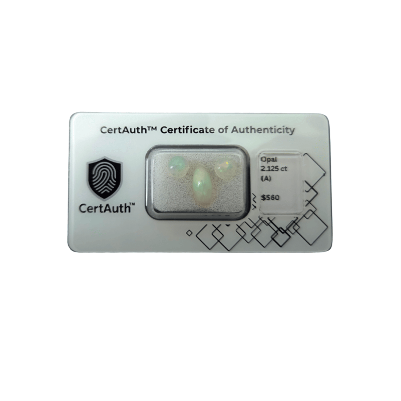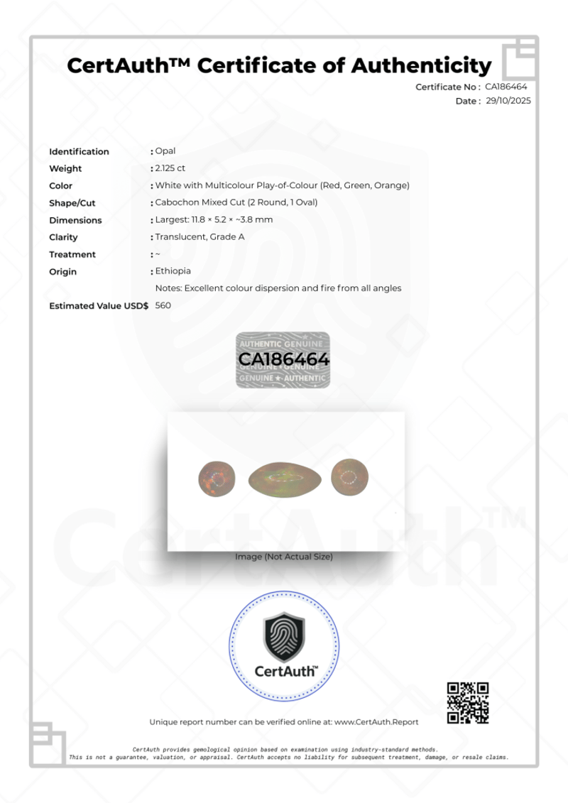 ETHIOPIAN OPAL TRIO – 2.13CT TOTAL, CERTIFIED BY CERTAUTH™ A Stunning Trio Of Natural Ethiopian Opals Exhibiting Vivid Multicolour Play-Of-Colour Across Red, Green, And Orange Hues. Each Cabochon Displays Exceptional Brilliance And Dispersion, Making This A Perfect Collector’S Set Or Design Suite.Details:• Gemstone: Opal• Total Weight: 2.125 Ct• Colour: White With Multicolour Play-Of-Colour (Red, Green, Orange)• Shape/Cut: Cabochon Mixed Cut (2 Round, 1 Oval)• Dimensions: Largest – 11.8 × 5.2 × ~3.8 Mm• Clarity: Translucent, Grade A• Treatment: ~ (None)• Origin: Ethiopia• Certification: Certauth™ No. Ca186464• Estimated Value: Usd $560Comments:Displays Excellent Colour Dispersion And Fire From All Angles. These Opals Feature Bright, Lively Hues Ideal For Custom Jewellery Settings Or High-Quality Gemstone Collections. Valuations Provided by an Independent Third-Party Professional Not Directly Associated With Lloyds Auctions at AUD $$560 USDThis valuation has been conducted by an independent third-party professional. The valuation amount is an assessment by the issuing valuer and does not reflect the auction value of the item. Any inquiries regarding the valuation should be directed to the issuing valuer (refer to contact details on the certificate), as Lloyds Auctions has no affiliation or influence over the valuation, the valuer, or the stated amount. Condition: Good - Refer Images 0488341+186464