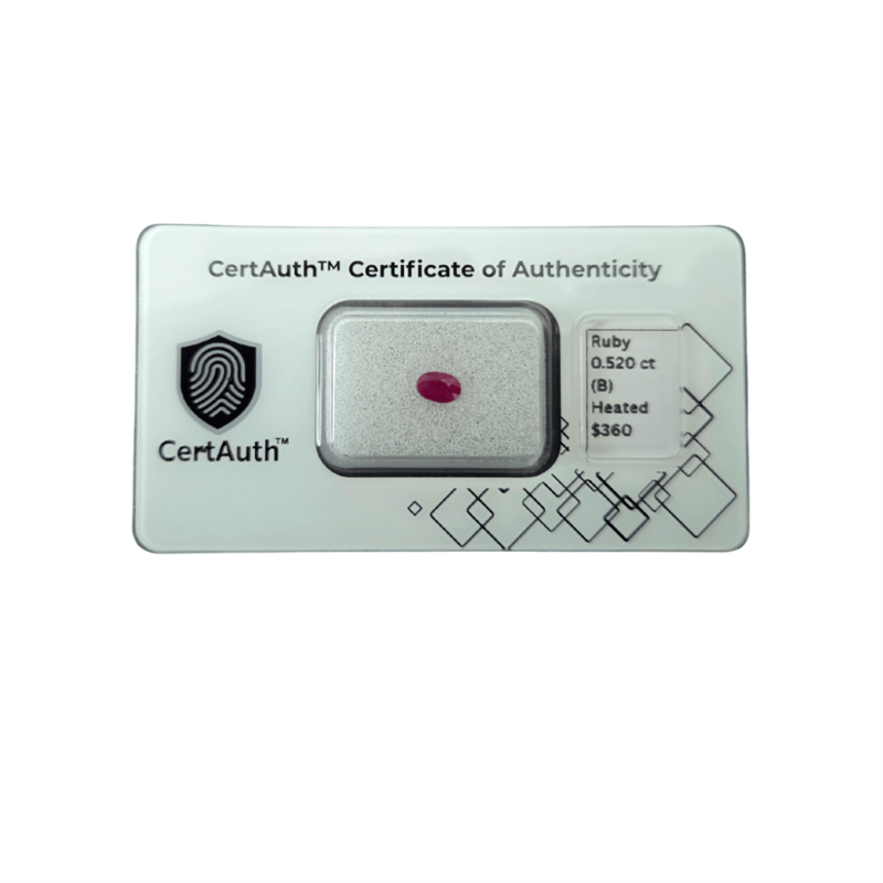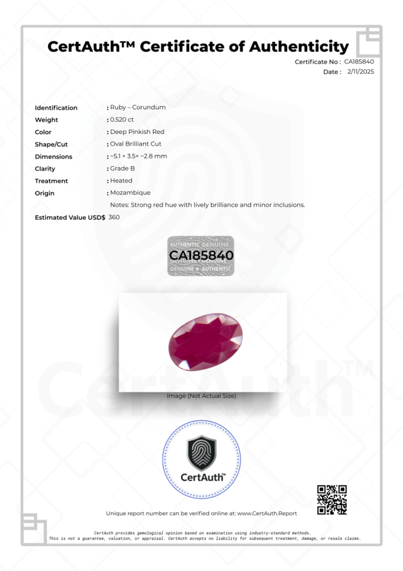 MOZAMBICAN RUBY – 0.52CT, CERTIFIED BY CERTAUTH A Vivid Ruby From Mozambique Featuring A Deep Pinkish-Red Tone And Excellent Sparkle. This Gemstone Exhibits Fine Colour Saturation And Lively Internal Fire, Ideal For A Ring Or Custom Pendant Design.Details:• Gemstone: Ruby – Corundum• Weight: 0.520 Ct• Colour: Deep Pinkish Red• Shape/Cut: Oval Brilliant Cut• Dimensions: ~5.1 × 3.5 × ~2.8 Mm• Clarity: Grade B• Treatment: Heated• Origin: Mozambique• Certification: Certauth No. Ca185840• Estimated Value: Usd $360Comments:Bright, Well-Cut Ruby With Strong Brilliance And Minimal Inclusions. Excellent Value And Beauty From Mozambique’S Renowned Ruby Deposits. Condition: Good - Refer Images 0488342+185840