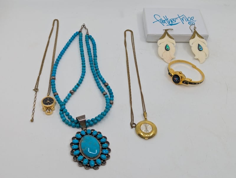 Includes Faux Gold Watch Pendants On Chains, Feather Tribe Paua Shell Earrings And More