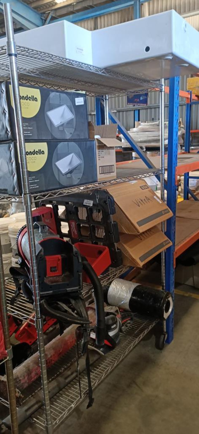 Assorted DIY Items Including Vice, Water Tank, Basins, Smoke Alarms & More SOLD AS LOT NOTE: CHROME RACK NOT INCLUDED NOTE: PICK UP ONLY NOTE: MUST BE COLLECTED WITHIN 48 HOURS OF AUCTION