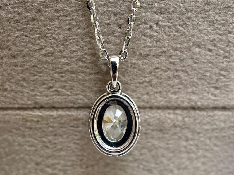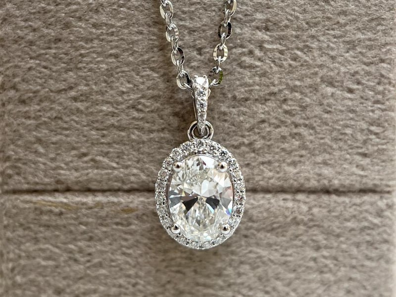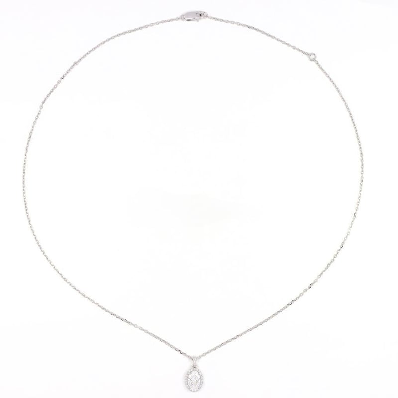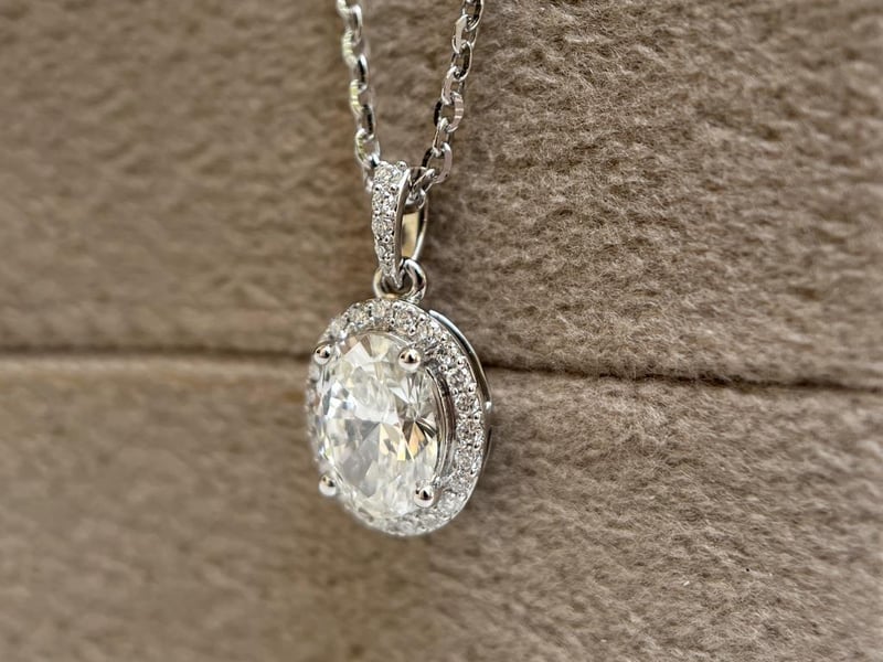 Crafted In 18K White Gold, This Necklace Features 1 Ct D Vs1 Oval Cut Lab Grown With A Halo.