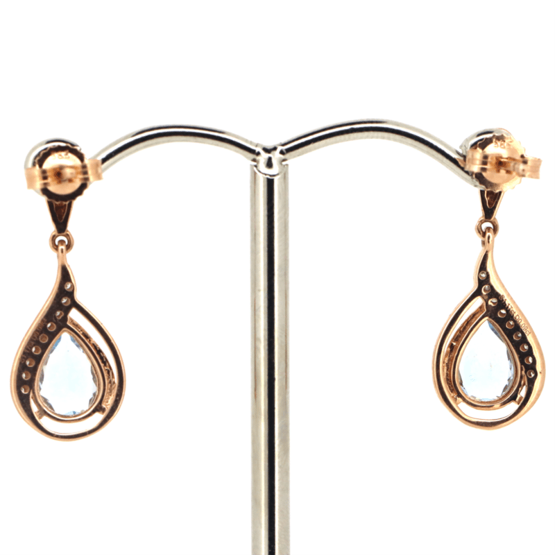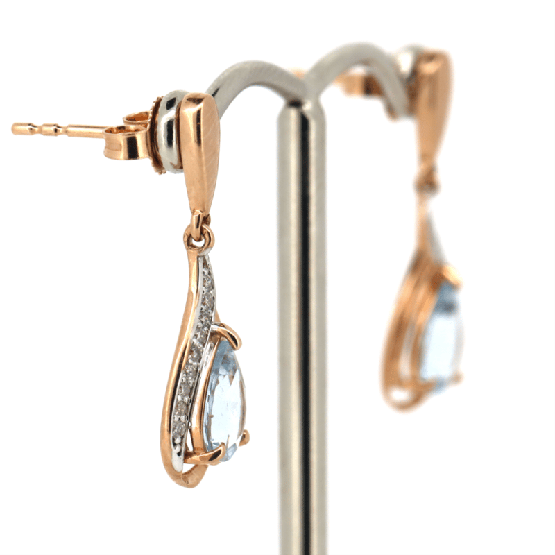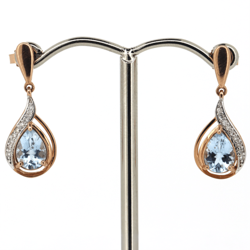 14K ROSE GOLD, AQUAMARINE AND DIAMOND, DROP EARRINGS.