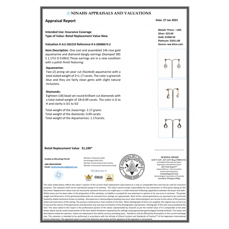 The Centres Feature, 2 Pear Cut Greyish-Blue, Aquamarines (1.17Ct Tsw, Minor Eye Inclusions). Encompassing The Design Are, 18 Round Brilliant Cut, Diamonds (0.09Ct Tdw, J-K Colour, Si2-I2 Clarity), Bead Set In White Gold. The Earrings Have Post Backs, With 14K Rose Gold Butterfly Clasps.