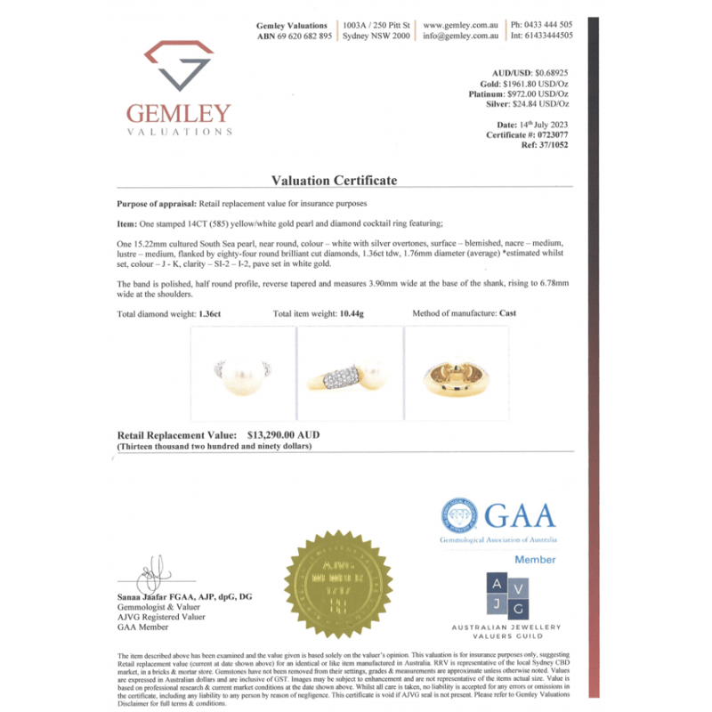 This Insurance Valuation has been provided by a registered Jewellery Valuer and is intended for insurance purposes only. The valuation amount has no bearing on the auction value of the item. Any questions regarding the valuation should be directed to the issuing Valuer (refer to contact details on the certificate) as Lloyds have no association or relationship with the Valuer or the valuation amount contained within the valuation.