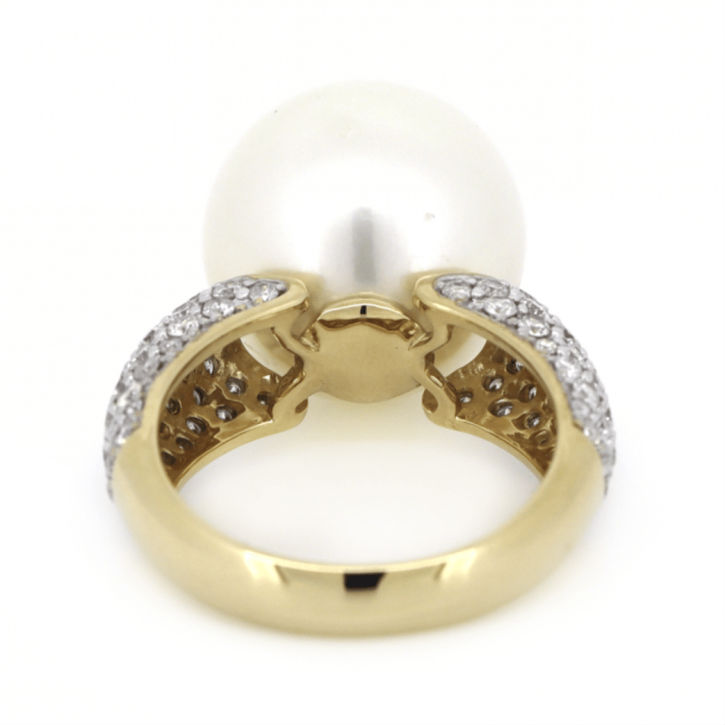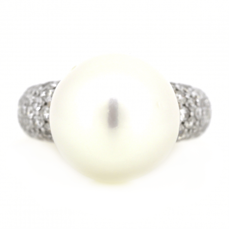 The Centre Features, One Near Round, White With Silver Overtones, Cultured South Sea Pearl (15.22Mm Size, Medium Lustre, Blemished). Decorating The Band Are, 84 Round Brilliant Cut, Diamonds (1.36Ct Tdw, J-K Colour, Si2-I2 Clarity), Pave Set In White Gold. Ring Size N.