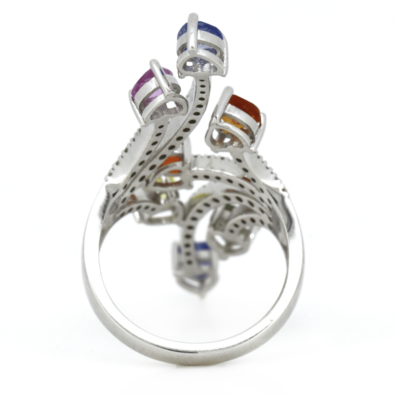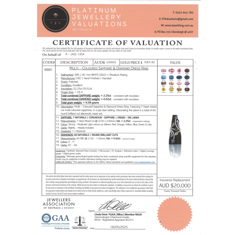 14K YELLOW GOLD, MULTI-COLOURED SAPPHIRE AND DIAMOND, DRESS RING. The Ring Features, 7 Heart Cut, Red, Orange, Yellow, Blue, Green And Lilac, Sapphires (2.25Ct Tsw, Heavily Included, Enhanced), Pip-Claw Set. Decorating The Piece Are, 60 Round Brilliant Cut, Diamonds (0.52Ct Tdw, G-H Colour, Si1-Si2 Clarity), Bead Set. Ring Size M. Jewellery Valuations Provided By A Third Party Professional Not Directly Associated With Lloyds Auctions at AUD $20,000.00This Insurance Valuation has been provided by a registered Jewellery Valuer and is intended for insurance purposes only. The valuation amount has no bearing on the auction value of the item. Any questions regarding the valuation should be directed to the issuing Valuer (refer to contact details on the certificate) as Lloyds have no association or relationship with the Valuer or the valuation amount contained within the valuation. Condition: NEW 0645874+16