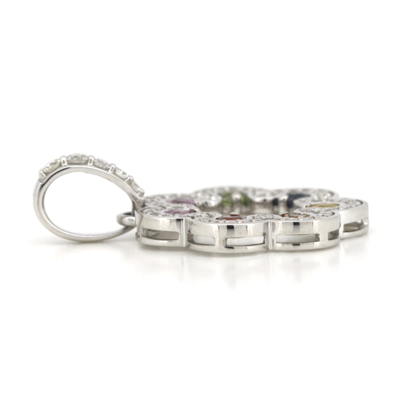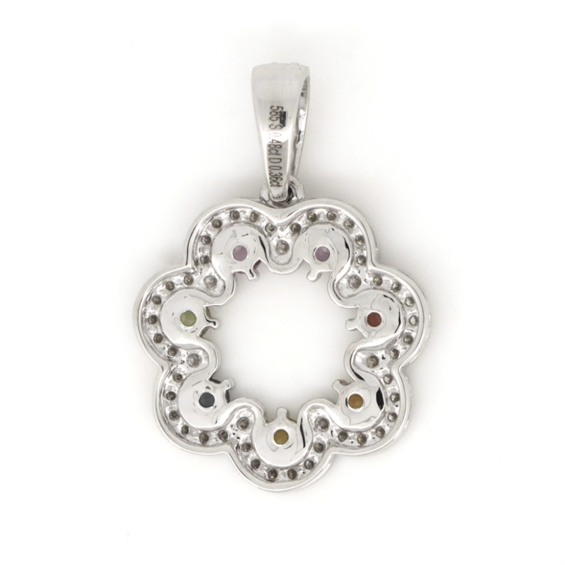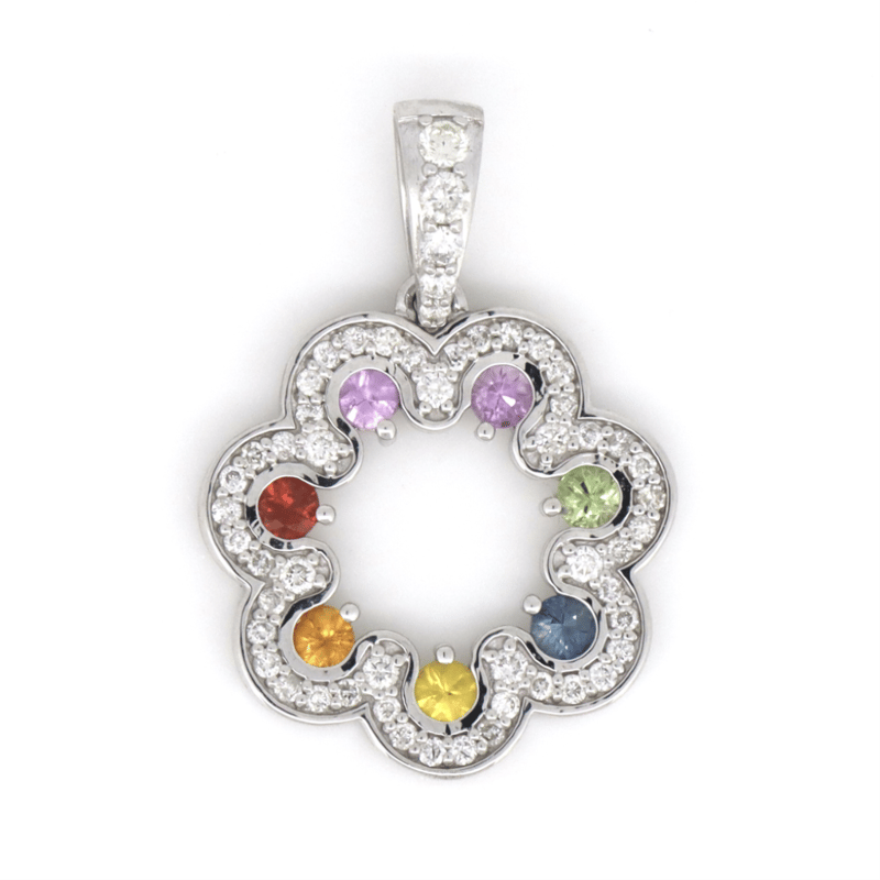 14K WHITE GOLD, MULTI-COLOURED SAPPHIRE AND DIAMOND, DECORATIVE PENDANT. The Design Features, 14 Round Faceted Cut, Pink, Green, Blue, Yellow, Orange And Red, Sapphires (0.48Ct Tsw, Eye Clean Clarity), Claw Set. Accompanying The Sapphires And Decorating The Drop Are, 54 Round Brilliant Cut, Diamonds (0.36Ct Tdw, G-I Colour, Si-I2 Clarity), Bead Set. Total Item Weight 2.4Grams. Jewellery Valuations Provided By A Third Party Professional Not Directly Associated With Lloyds Auctions at AUD $8,400.00This Insurance Valuation has been provided by a registered Jewellery Valuer and is intended for insurance purposes only. The valuation amount has no bearing on the auction value of the item. Any questions regarding the valuation should be directed to the issuing Valuer (refer to contact details on the certificate) as Lloyds have no association or relationship with the Valuer or the valuation amount contained within the valuation. Condition: NEW 0645874+43