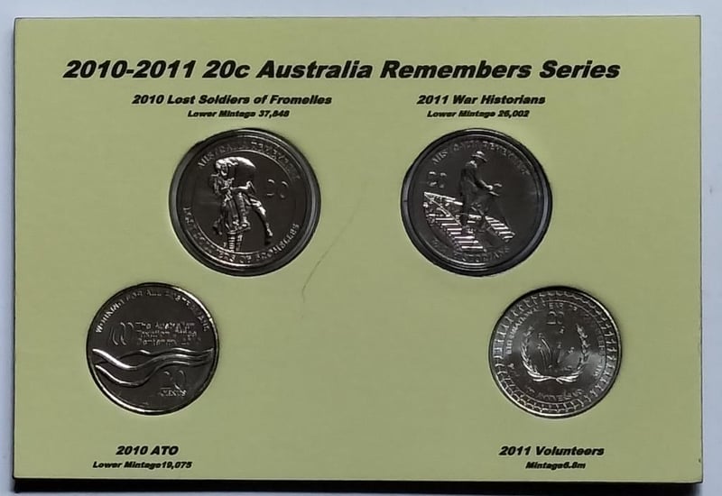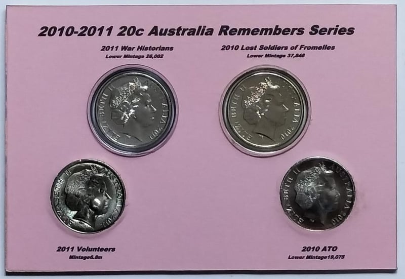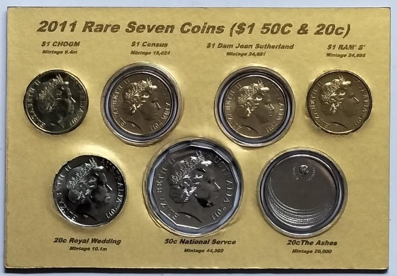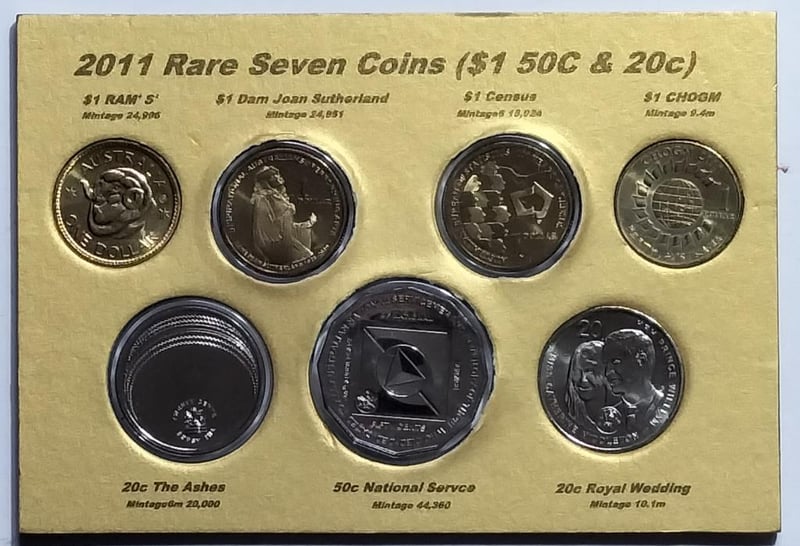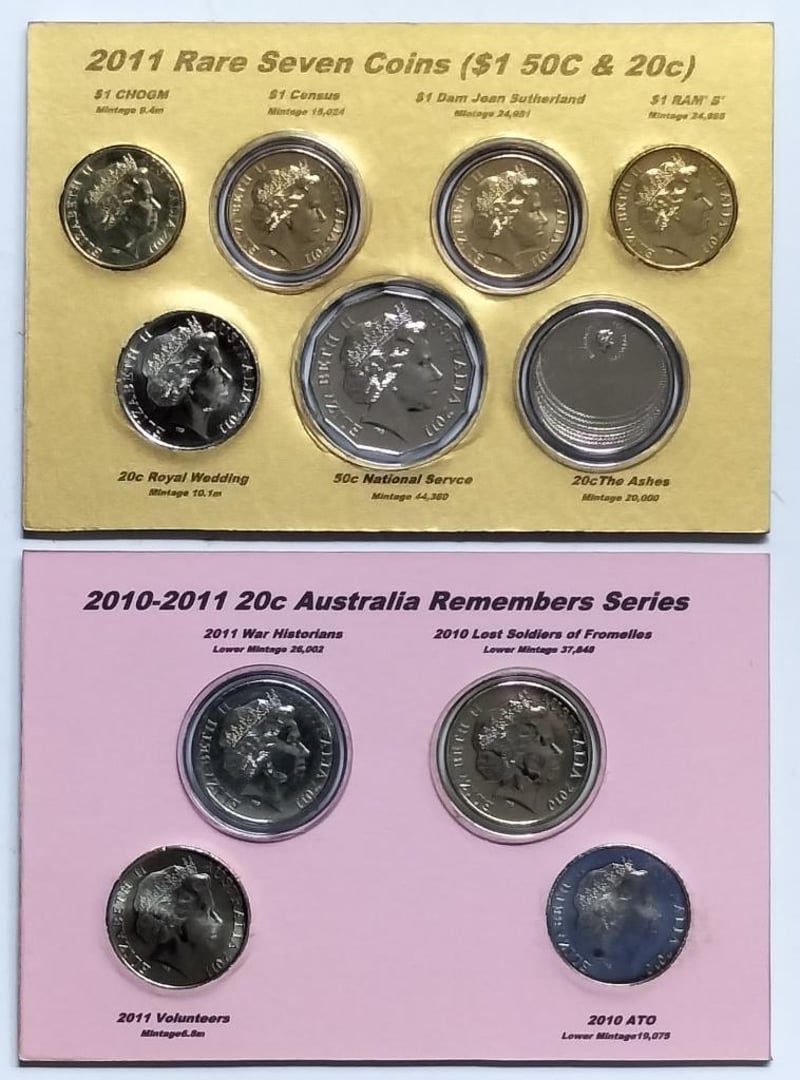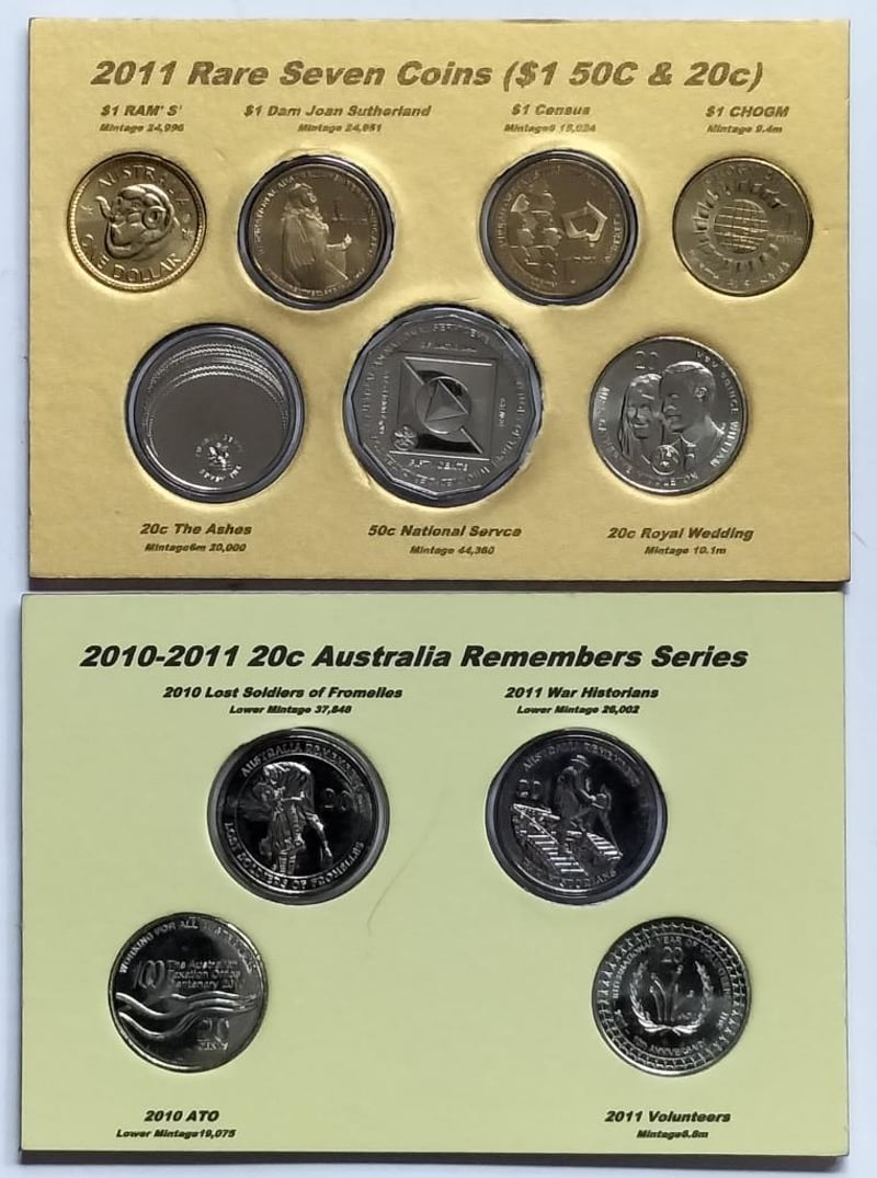2011 Rare Seven Coins ($1 50C & 20C) $1 Dam Joan Sutherland; Census; Ram'S' & Chogm; 50C National Service; & 2011 20C Australia Remembers Series Lower Mintage-Lost Soldiers Of Fromelles (2010) & War Historians (2011) Included