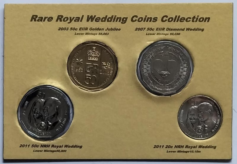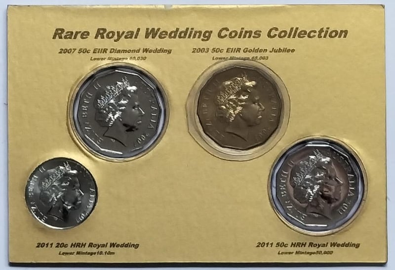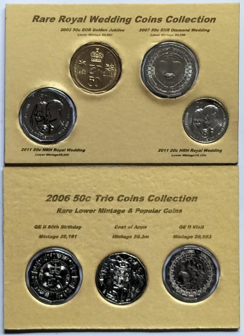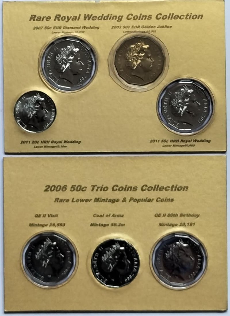 2003-11 Rare Royal Wedding Coins Set 2003/07 50C Eiir Golden Jublee & Diamond Wedding; 2011 50C &20C Hrh Royal Wedding; & 2006 Trio 50C Coins Collection Lower Mintage Qe Ii 80Th Birthday, Qe Ii Visit & Coa