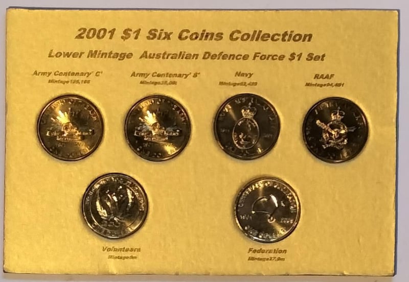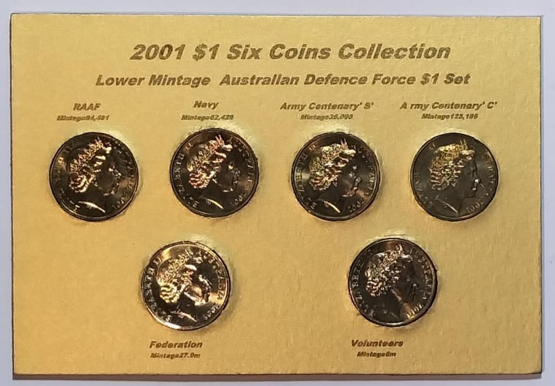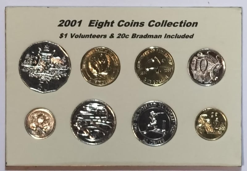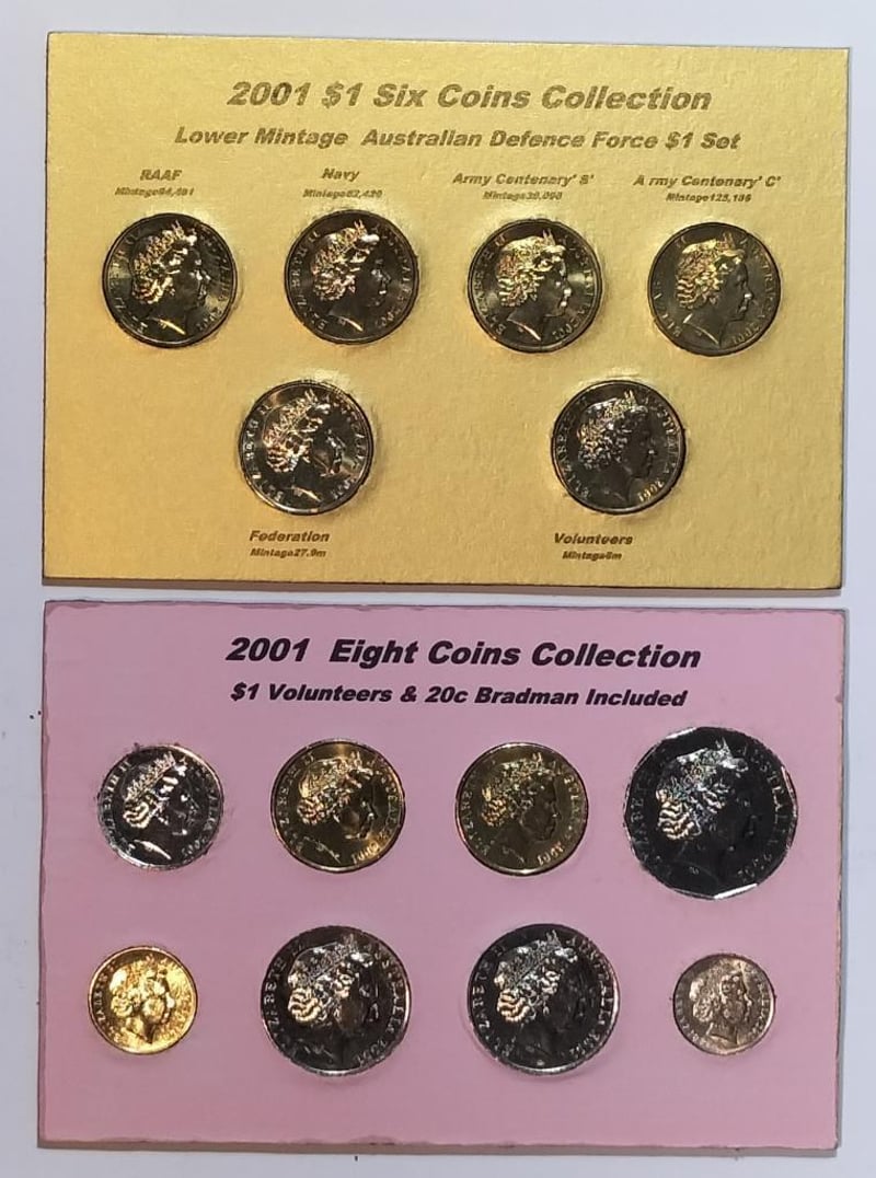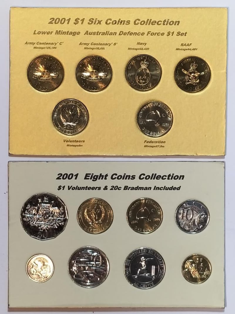 2001 RARE AUSTRALIAN DEFENCE FORCE $1 SET; AND 2001 EIGHT COINS COLLECTION $1 VOLUNTEERS & 20C BRADMAN INCLUDED Two Parts Condition: UNCEx Mint Folder/Roll488362+6