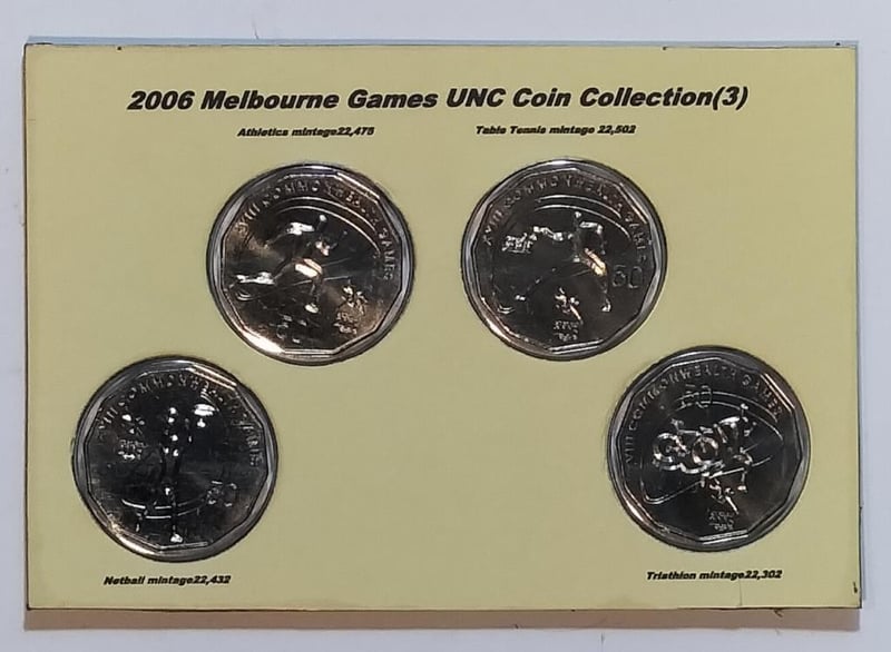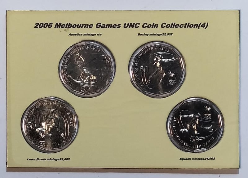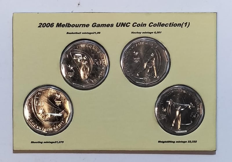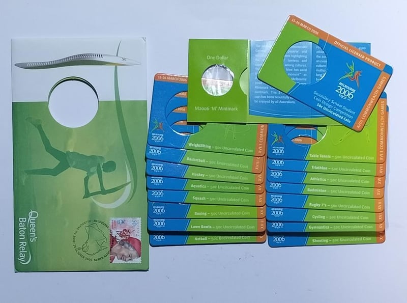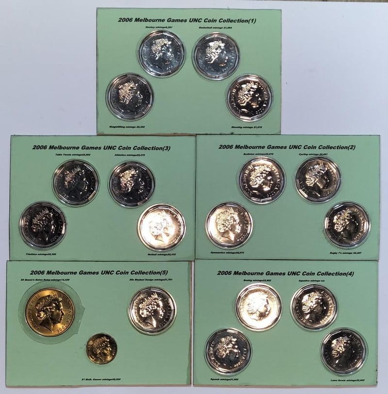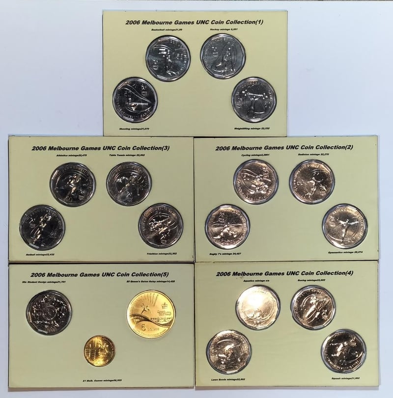2006 MELBOURN XVIII COMMONWEALTH GAMES 50C COIN SET 16+3 Include: 16Xsport 50C; 1Xstudent Design 50C; 1X $5 Queen Baton Relay; And 1X$1 Melb.Games(Extra). 19 Coins In Total In 5 Penels.. All Coins Are Unc, Ex From Mint Card Condition: UNCEx Mint Folder/Roll488362+7