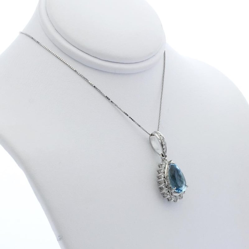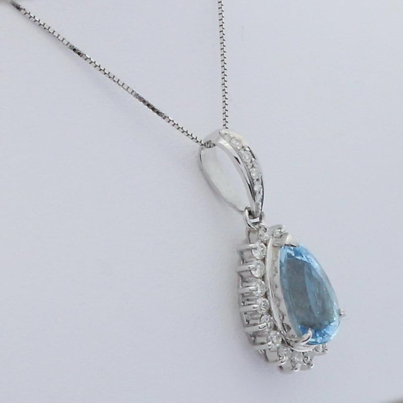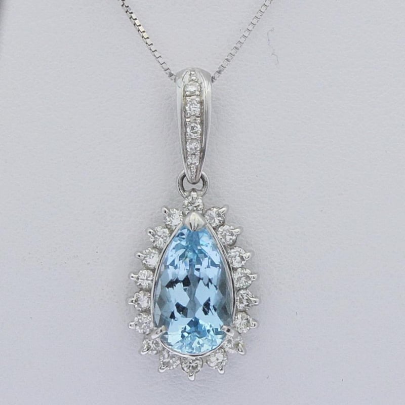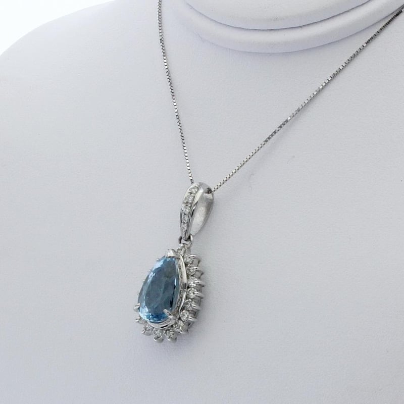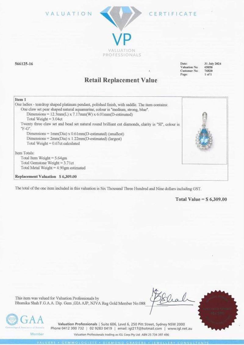 TEARDROP SHAPED PLATINUM PENDANT One Ladies - Teardrop Shaped Platinum Pendant, Polished Finish, With Saddle. The Item Contains: One Claw Set Pear Shaped Natural Aquamarine, Colour Is "Medium, Strong, Blue". Dimensions = 12.3Mm(L) X 7.17Mm(W) X 6.01Mm(D-Estimated) Total Weight = 3.04Ct Twenty Three Claw Set And Bead Set Natural Round Brilliant Cut Diamonds, Clarity Is "Si", Colour Is "F-G". Dimensions = 1Mm(Dia) X 0.61Mm(D-Estimated) (Smallest) Dimensions = 2Mm(Dia) X 1.22Mm(D-Estimated) (Largest) Total Weight = 0.67Ct Calculated Item Totals: Total Item Weight = 5.64Gm Total Gemstone Weight = 3.71Ct Total Metal Weight = 4.90Gm Estimated Valuations Provided by an Independent Third-Party Professional Not Directly Associated With Lloyds Auctions at AUD $6309 This valuation has been conducted by an independent third-party professional. The valuation amount is an assessment by the issuing valuer and does not reflect the auction value of the item. Any inquiries regarding the valuation should be directed to the issuing valuer (refer to contact details on the certificate), as Lloyds Auctions has no affiliation or influence over the valuation, the valuer, or the stated amount. Condition: Good - Refer Images 0 488973+15
