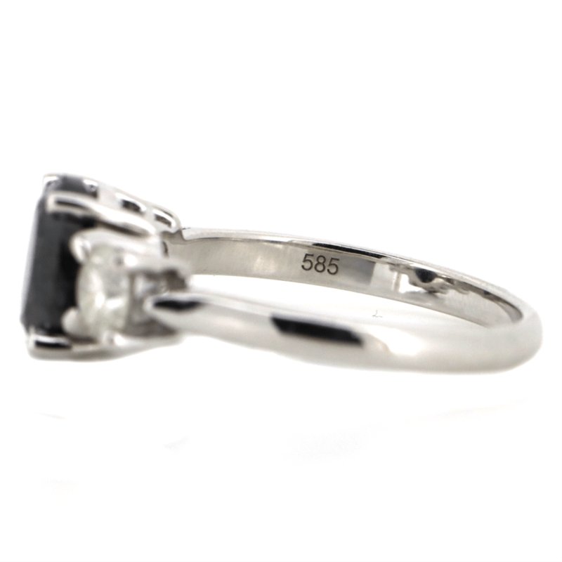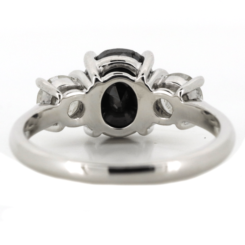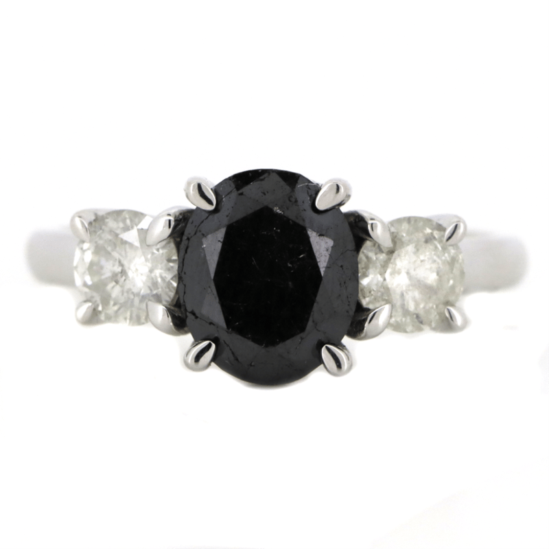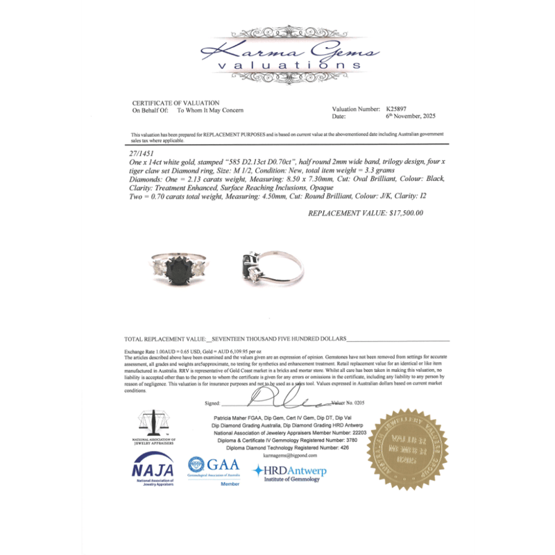 14K WHITE GOLD, BLACK DIAMOND AND DIAMOND, TRILOGY RING. The Centre Features, One Oval Faceted Cut, Black Diamond (2.13Ct Opaque), Claw Set. Either Side Of The Centre Are, 2 Round Brilliant Cut, Diamonds (0.70Ct Tdw, J-K Colour, I2 Clarity), Claw Set. Ring Size M 1/2. Jewellery Valuations Provided By A Third Party Professional Not Directly Associated With Lloyds Auctions at AUD $17,500.00This Insurance Valuation has been provided by a registered Jewellery Valuer and is intended for insurance purposes only. The valuation amount has no bearing on the auction value of the item. Any questions regarding the valuation should be directed to the issuing Valuer (refer to contact details on the certificate) as Lloyds have no association or relationship with the Valuer or the valuation amount contained within the valuation. Condition: NEW 0645874+33