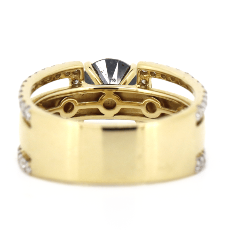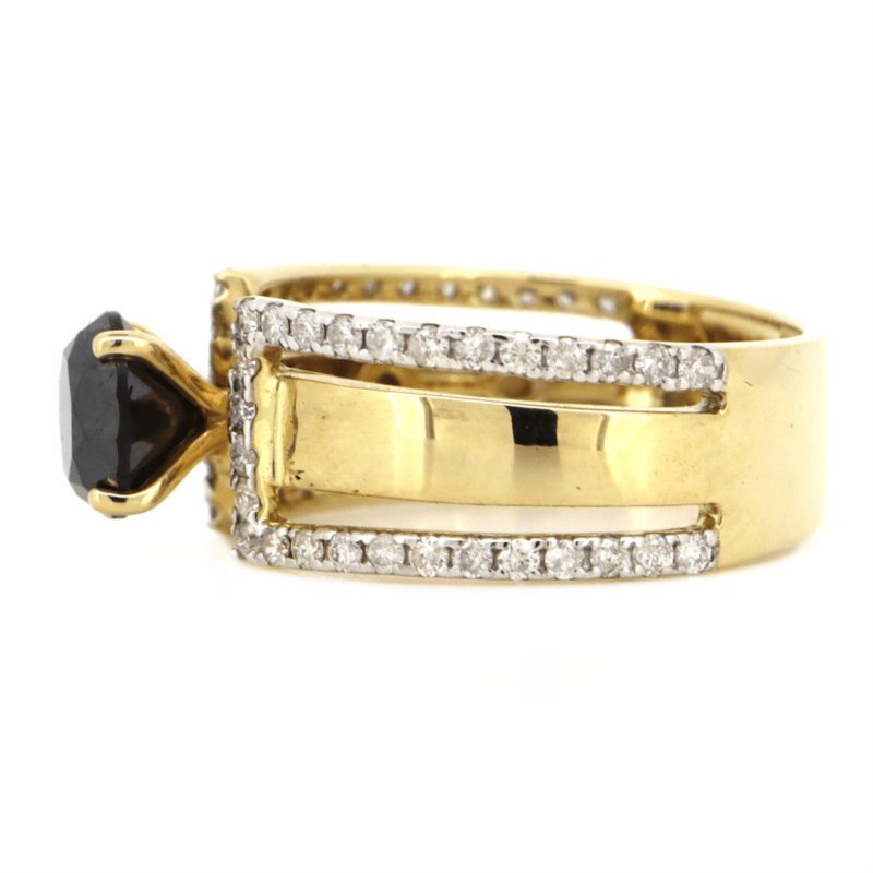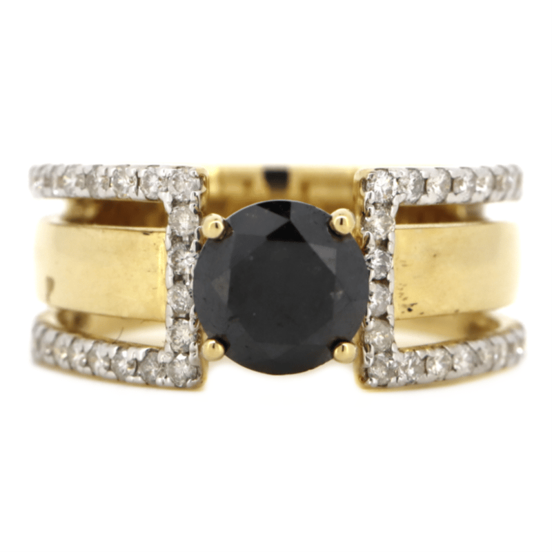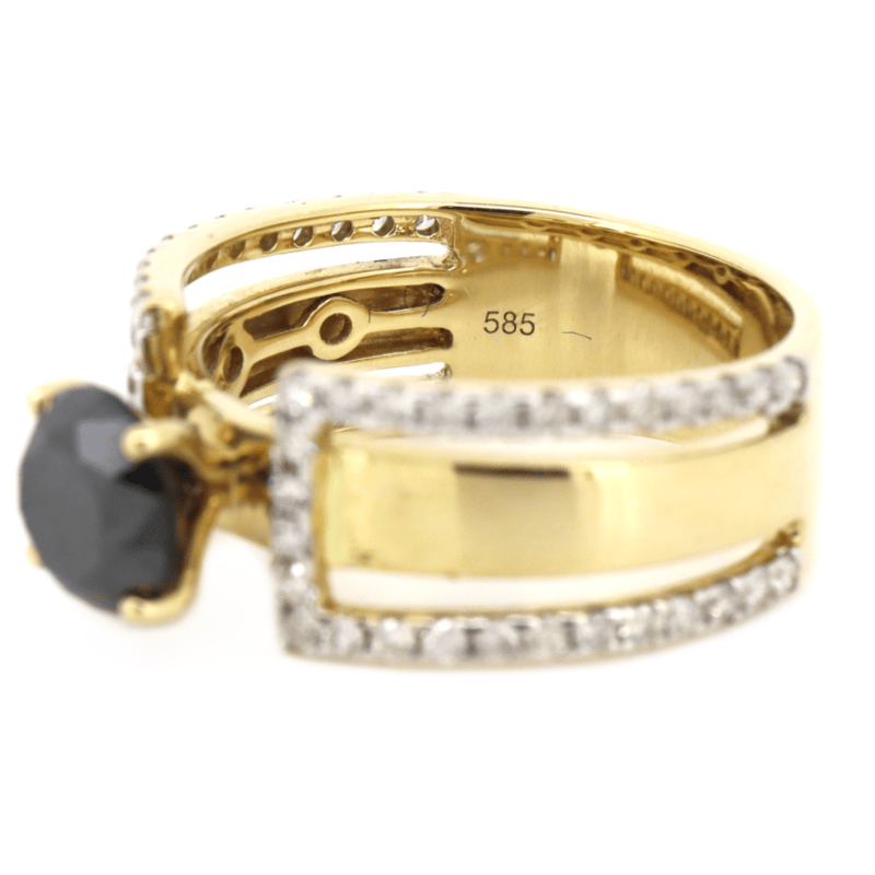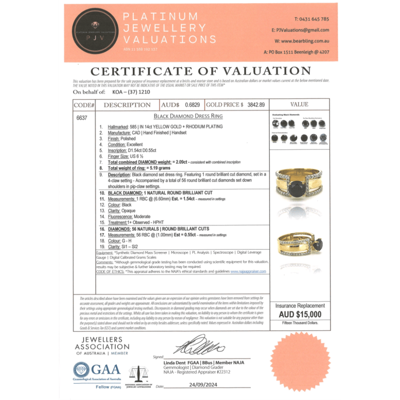 14K YELLOW GOLD, BLACK DIAMOND AND DIAMOND, DRESS RING. The Centre Features, One Round Brilliant Cut, Black, Diamond (1.54Ct, Opaque, Enhanced), 4 Claw Set. Decorating The Band Are, 56 Round Brilliant Cut, Diamonds (0.55Ct Tdw, G-H Colour, Si1-Si2 Clarity), Claw Set. Ring Size M 1/2. Jewellery Valuations Provided By A Third Party Professional Not Directly Associated With Lloyds Auctions at AUD $15,000.00This Insurance Valuation has been provided by a registered Jewellery Valuer and is intended for insurance purposes only. The valuation amount has no bearing on the auction value of the item. Any questions regarding the valuation should be directed to the issuing Valuer (refer to contact details on the certificate) as Lloyds have no association or relationship with the Valuer or the valuation amount contained within the valuation. Condition: NEW 0645874+9