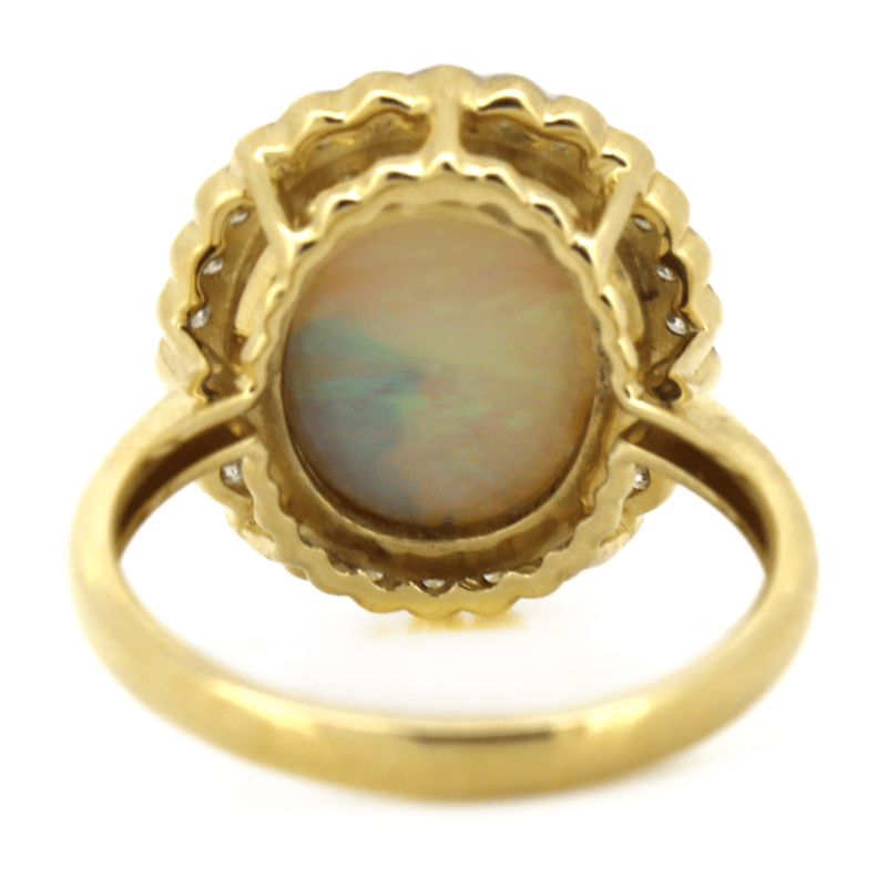 14K YELLOW GOLD, 4.29CT AUSTRALIAN ANDAMOOKA OPAL AND DIAMOND, HALO RING. The Central Design Features, One Oval Cabochon, Grey, Green Base, Australian Andamooka Opal (4.29Ct, Flashes Of Orange, Green, Blue, Purple, Yellow, Moderate Crazing, Patchy-Broad Flashes Pattern), Bezel Set. Surrounding The Centre In Halo Are, 26 Round Brilliant Cut, Diamonds (0.39Ct Tdw, H-K Colour, P1+ Clarity), Bead Set. Ring Size M. Jewellery Valuations Provided By A Third Party Professional Not Directly Associated With Lloyds Auctions at AUD $14,500.00This Insurance Valuation has been provided by a registered Jewellery Valuer and is intended for insurance purposes only. The valuation amount has no bearing on the auction value of the item. Any questions regarding the valuation should be directed to the issuing Valuer (refer to contact details on the certificate) as Lloyds have no association or relationship with the Valuer or the valuation amount contained within the valuation. Condition: NEW 0645874+63