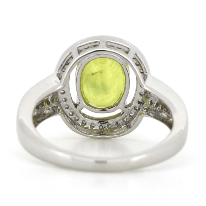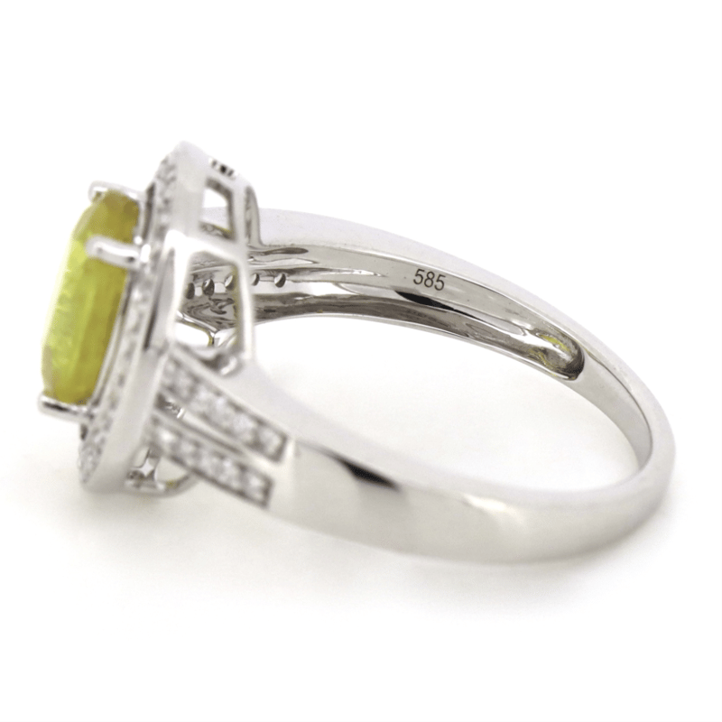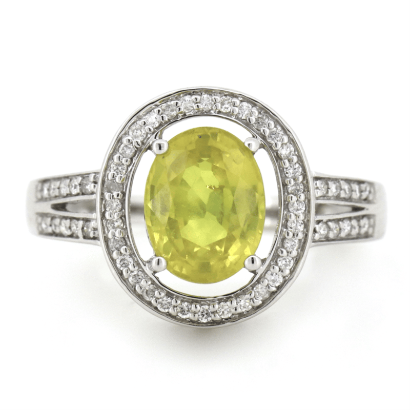 14K WHITE GOLD, YELLOW SAPPHIRE AND DIAMOND, HALO SPLIT BAND RING. The Centre Features, One Oval Mixed Cut, Moderate Vivid Yellow, Sapphire (1.80Ct, Moderately Included), 4 Claw Set. Surrounding The Centre In A Halo And Decorating The Shoulders Are, 52 Round Brilliant Cut, Diamonds (0.21Ct Tdw, G-H Colour, Si1-Si2 Clarity), Bead Set. Ring Size O. Jewellery Valuations Provided By A Third Party Professional Not Directly Associated With Lloyds Auctions at AUD $10,000.00This Insurance Valuation has been provided by a registered Jewellery Valuer and is intended for insurance purposes only. The valuation amount has no bearing on the auction value of the item. Any questions regarding the valuation should be directed to the issuing Valuer (refer to contact details on the certificate) as Lloyds have no association or relationship with the Valuer or the valuation amount contained within the valuation. Condition: NEW 0645874+42