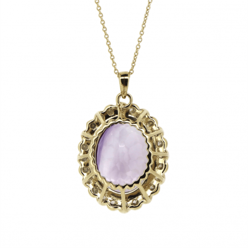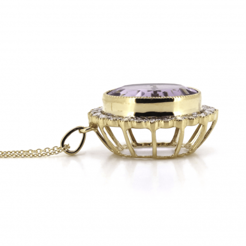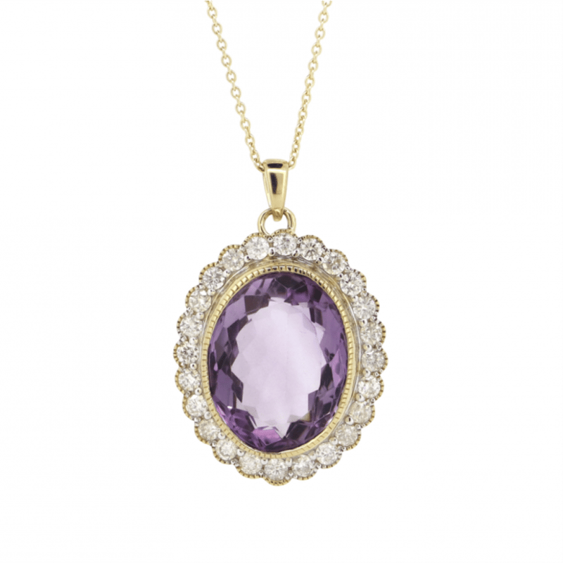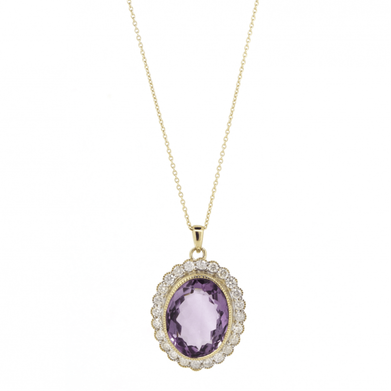 14K YELLOW GOLD, 9.03CT AMETHYST AND DIAMOND, STATEMENT NECKLACE. The Pendant Features Centre, One Oval Cut, Medium Light Reddish-Purple, Amethyst (9.03Ct, Minor Eye Visible Inclusions), Bezel Set With Millegrain Detail. Surrounding The Centre In A Halo Are, 24 Round Brilliant Cut, Diamonds (0.76Ct Tdw, J-K Colour, Si2-I2 Clarity), Semi-Bezel/Bead Set In White Gold, With Millegrain Detail. The Necklace Has A Lobster Claw Clasp. Necklace Length Is 44Cm. Jewellery Valuations Provided By A Third Party Professional Not Directly Associated With Lloyds Auctions at AUD $8,390.00This Insurance Valuation has been provided by a registered Jewellery Valuer and is intended for insurance purposes only. The valuation amount has no bearing on the auction value of the item. Any questions regarding the valuation should be directed to the issuing Valuer (refer to contact details on the certificate) as Lloyds have no association or relationship with the Valuer or the valuation amount contained within the valuation. Condition: NEW 0645874+61
