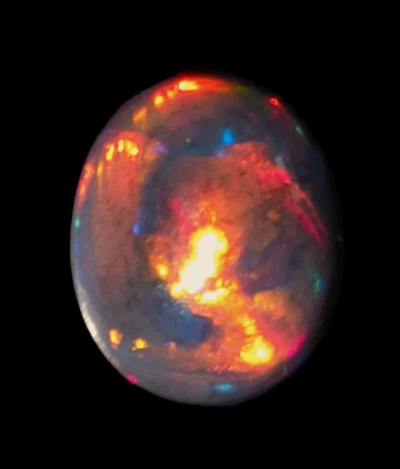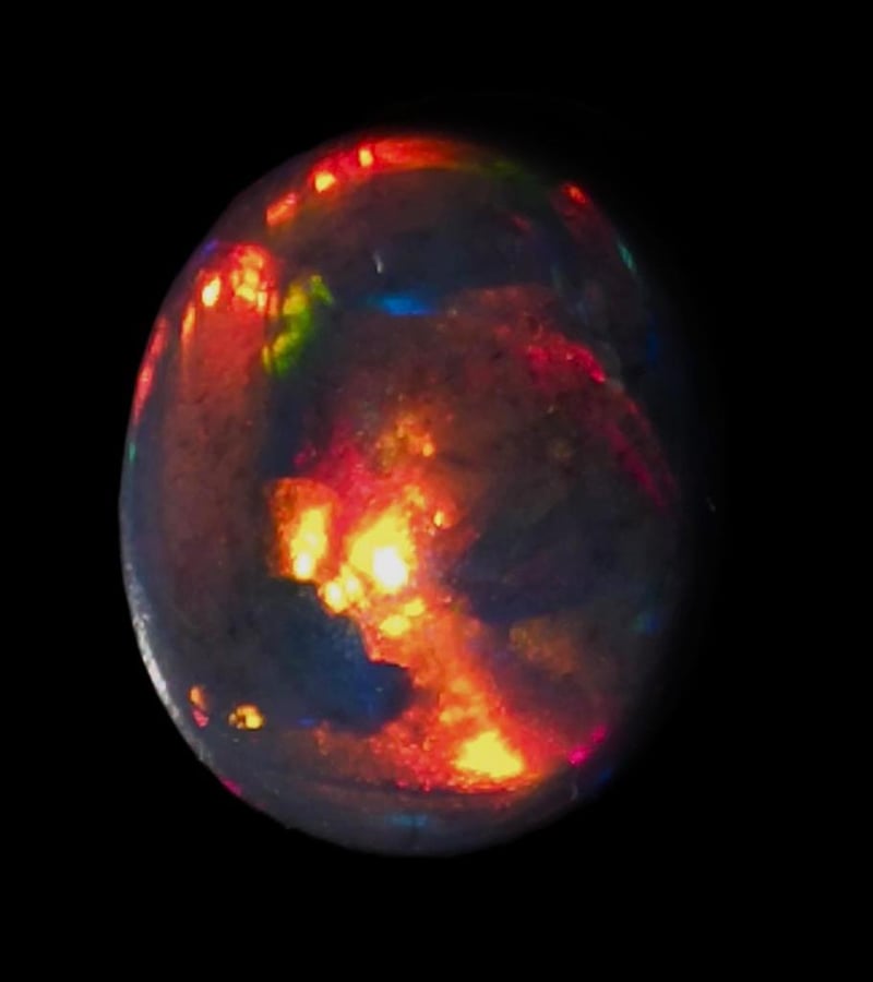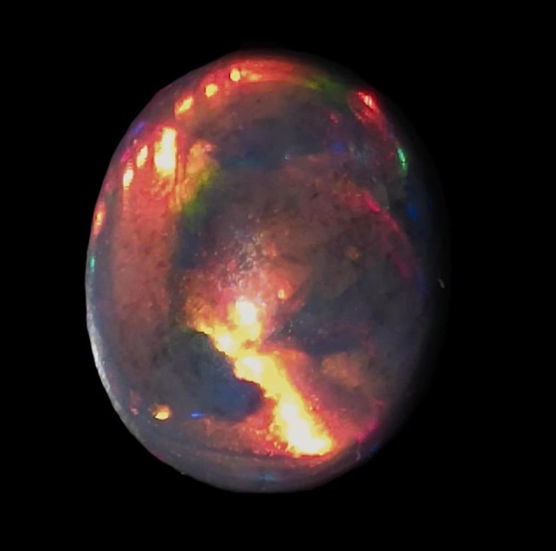 1.8 CARATS HIGH DOMED AFRICAN BLACK OPAL. Dimensions: 9x7x4mms Clear And Bright With Top Fire With Molten Reds Oranges Yellows Blues 0586253+100