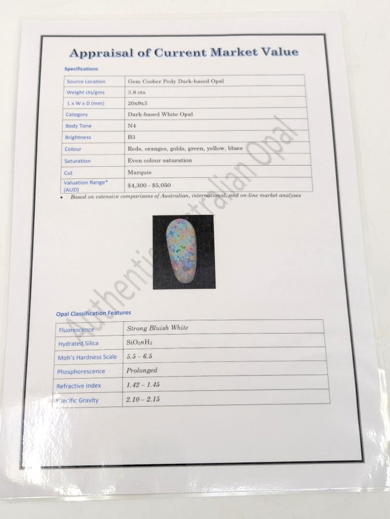 3.8 CARATS GEM COOBER PEDY DARK BASED OPAL Dimensions: 20x9x3mms Bright And Clean With Deep Intense Colour And Tone, Jewellery Ready. Jewellery Valuations Provided By A Third Party Professional Not Directly Associated With Lloyds Auctions at AUD $4300-5050 This Insurance Valuation has been provided by a registered Jewellery Valuer and is intended for insurance purposes only. The valuation amount has no bearing on the auction value of the item. Any questions regarding the valuation should be directed to the issuing Valuer (refer to contact details on the certificate) as Lloyds have no association or relationship with the Valuer or the valuation amount contained within the valuation. 0 586253+87