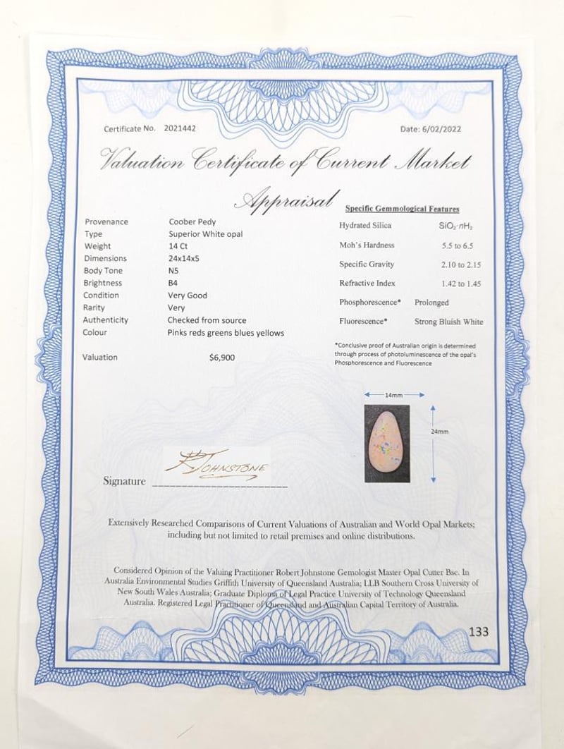 14 CARATS SUPERIOR COOBER PEDY WHITE OPAL Dimensions: 24X14x5mms Clean And Pure Gem With Dense And Even Colour Saturation Jewellery Valuations Provided By A Third Party Professional Not Directly Associated With Lloyds Auctions at AUD $6900 This Insurance Valuation has been provided by a registered Jewellery Valuer and is intended for insurance purposes only. The valuation amount has no bearing on the auction value of the item. Any questions regarding the valuation should be directed to the issuing Valuer (refer to contact details on the certificate) as Lloyds have no association or relationship with the Valuer or the valuation amount contained within the valuation. 0 586253+85