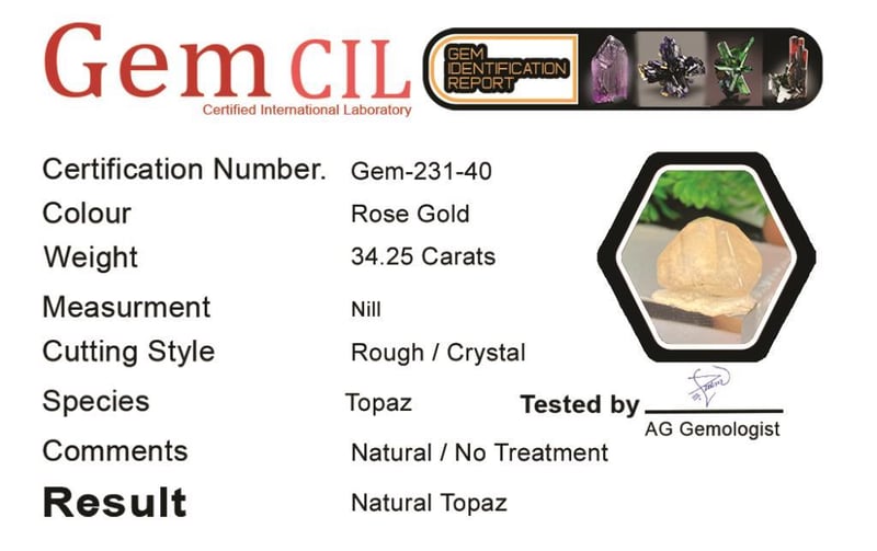 34.25 CARATS NATURALLY TERMINATED IMPERIAL ROSE GOLD TOPAZ SPECIMEN 34.25 Carats Naturally Terminated Imperial Rose Gold Topaz SpecimenStone = Natural TopazWeight = 34.25 Carats Colour = Rose Gold Cut = Naturally TerminatedLustre = Excellent Note = {Natural Termination Is Collectable}, Gem Cil, Certified Condition: Good - Refer Images 0488413+40