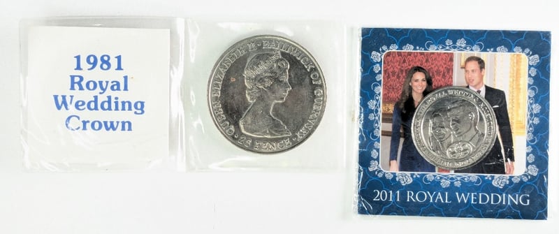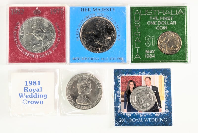 1981 Royal Wedding Crown Medallion, Hrh Prince William Catherine Middleton Commemorative Medallion 2011, Australian "First Dollar Coin 1984', Hm 1977 Queen Elizabeth Silver Jubilee Crown Medallion, Queen Elizabeth 80Th Birthday Medallion.