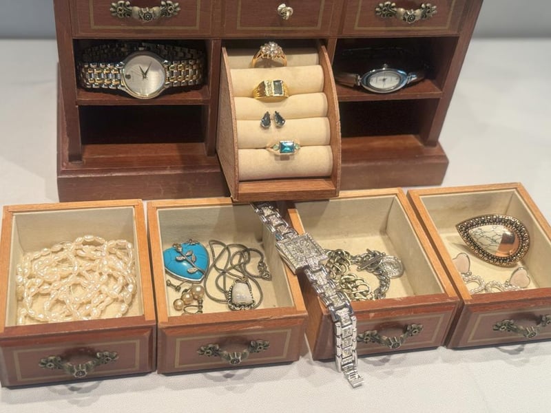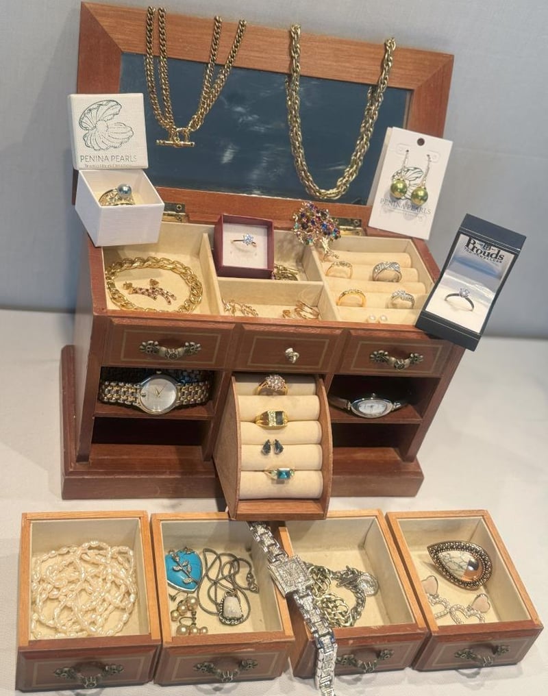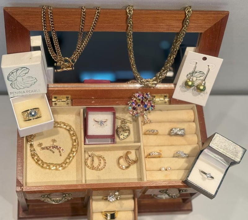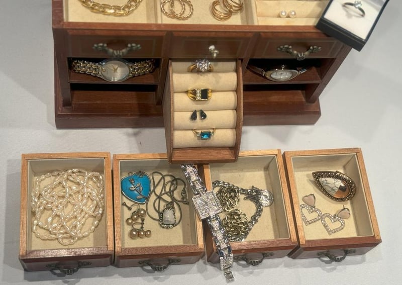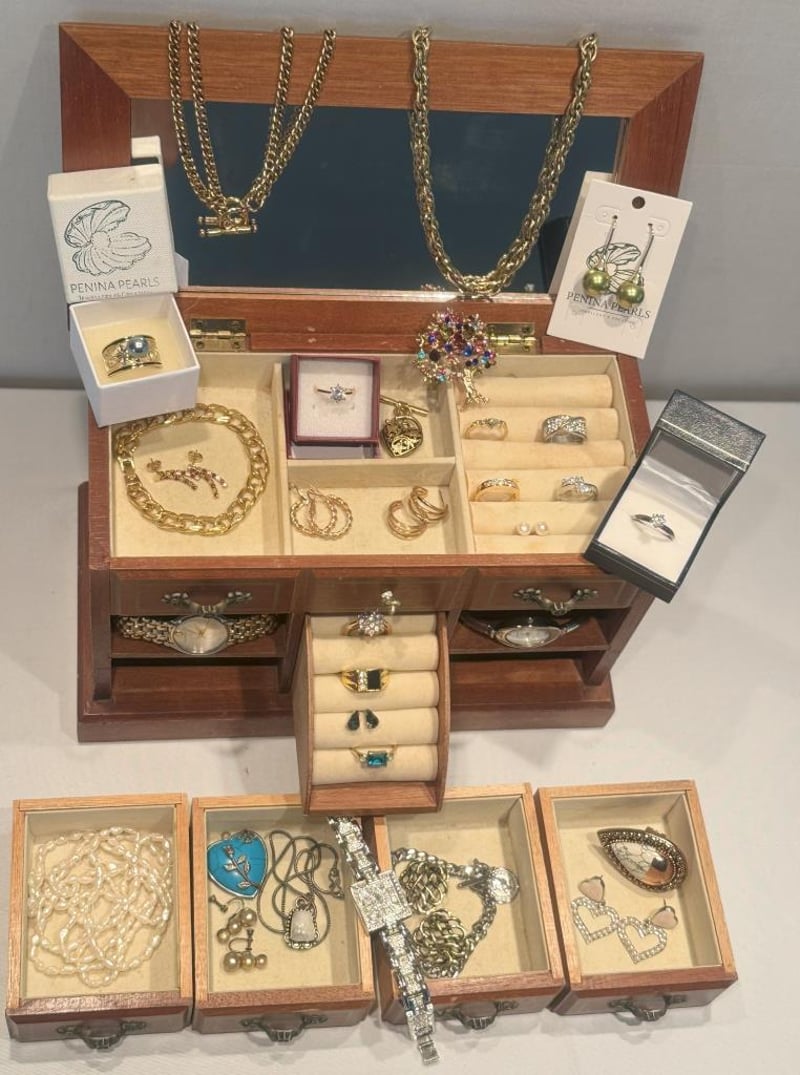 MUSICAL TIMBER JEWELLERY BOX WITH ASSORTED JEWELLERY INCLUDING NATURAL PEARLS, STERLING SILVER, SAMANTHA WILLS, VINTAGE & MORE.